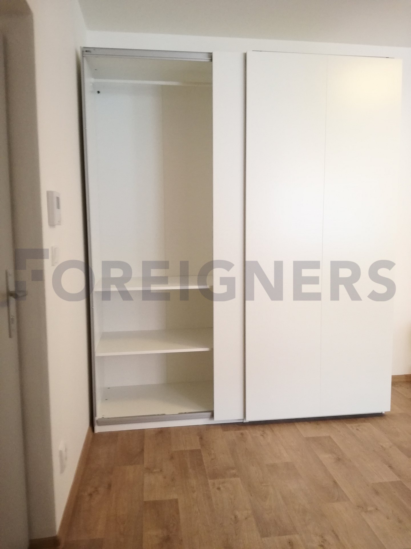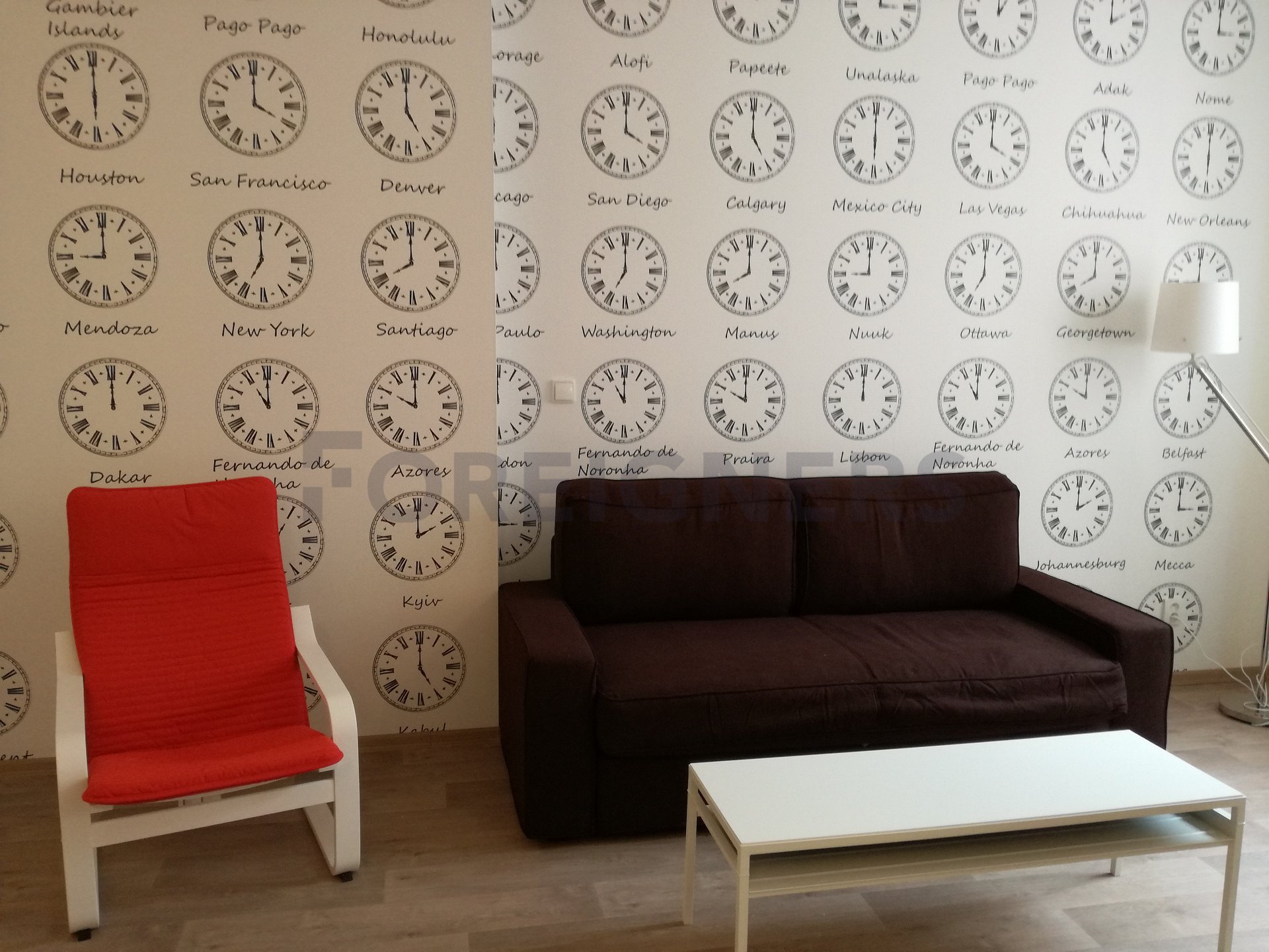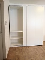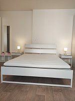 The apartment is furnished with modern-fitting furniture. The white colour of the kitchen unit with a hidden microwave oven and fridge. A white spacious wardrobe for clothes. A tenant can watch the TV from the bed or from a red sofa.