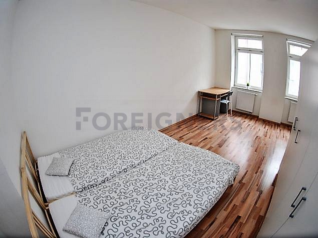 The kitchenette is equipped with a fridge, oven, and hob. There is also a dining table with chairs. In the bedroom, there are two single beds, a table and two wardrobes. Futhermore there is bathroom with bathtub and washing machine and a separate toilet. The whole apartment has 55 sqm. The room is approximately 15 sqm large. The entrance to the second bedroom is separated by 2 large wardrobes, ensuring sufficient privacy for your room.