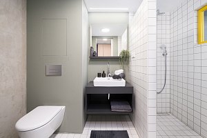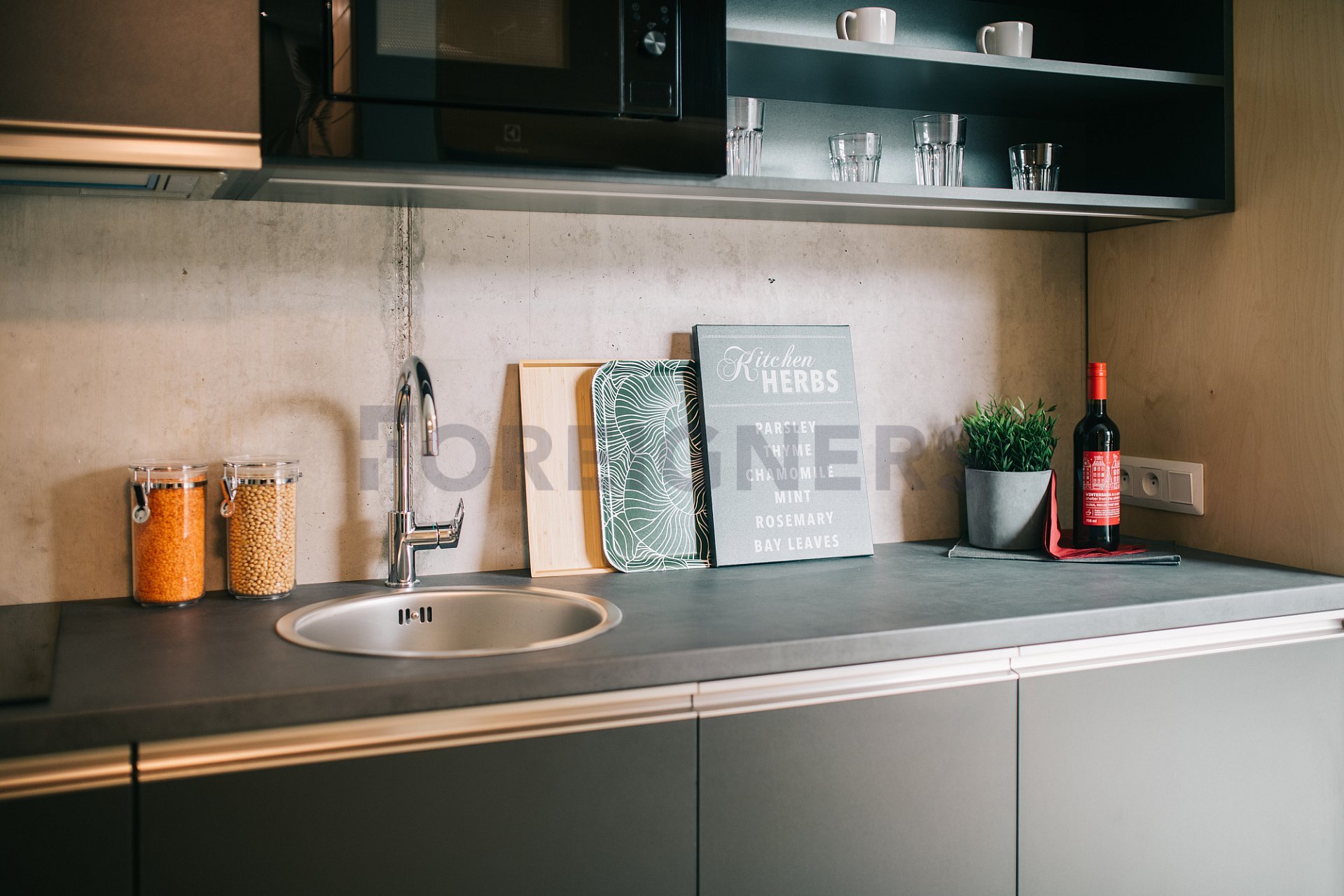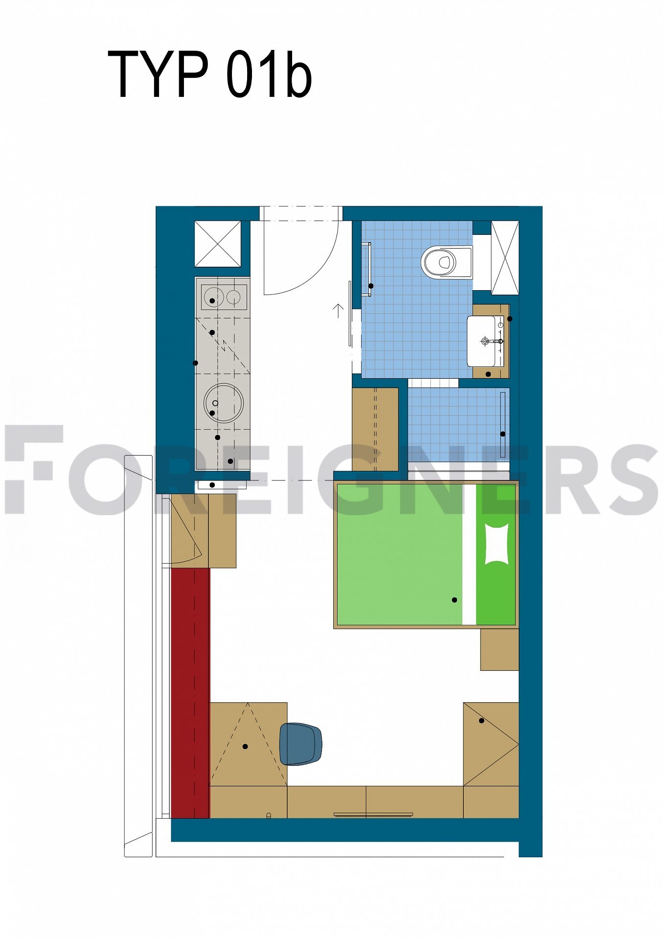This modern studio apartment is suitable for 1 person and consists of entrance hallway with kitchen corner, residential room, bathroom with shower corner + basin + toilet. Cooling + fresh air delivery system.