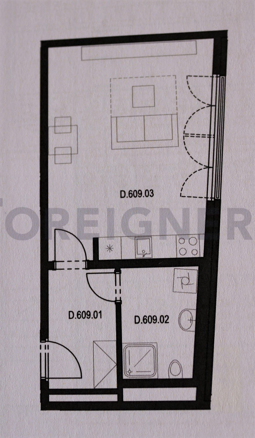 The apartment consists of a kitchen area connected to a living room, partly separated bedroom, a hall and a bathroom with a toilet. The studio has a nice views on the city.