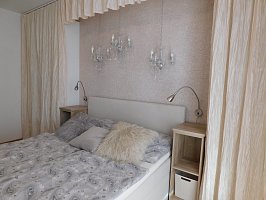 The bedroom part has an upholstered double bed including bed linen, bedside tables / bookcase, chest of drawers and a spacious wardrobe.