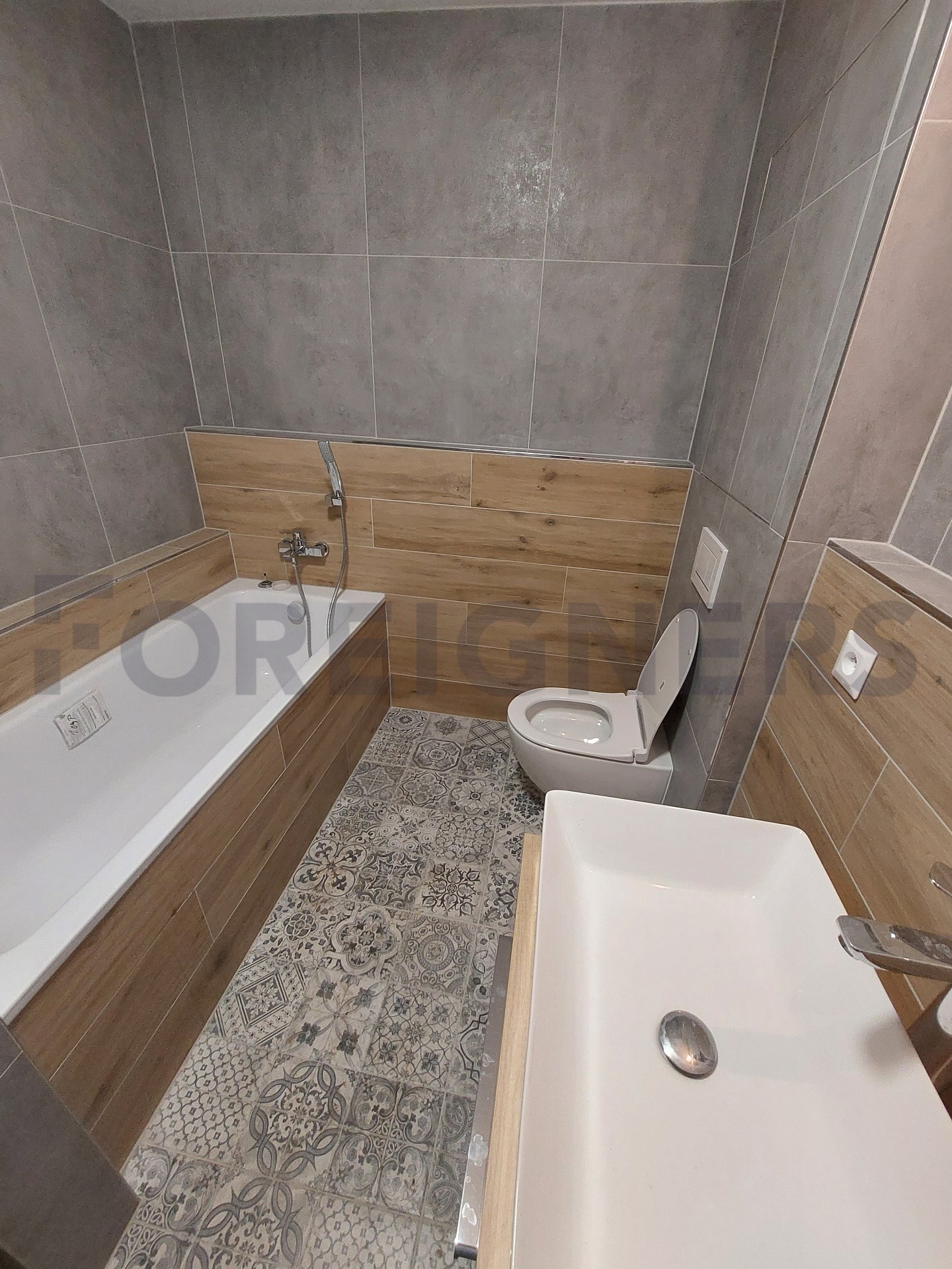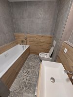 - There is a bathtub, wash-basin and toilet in the bathroom
