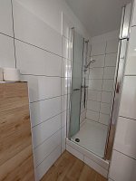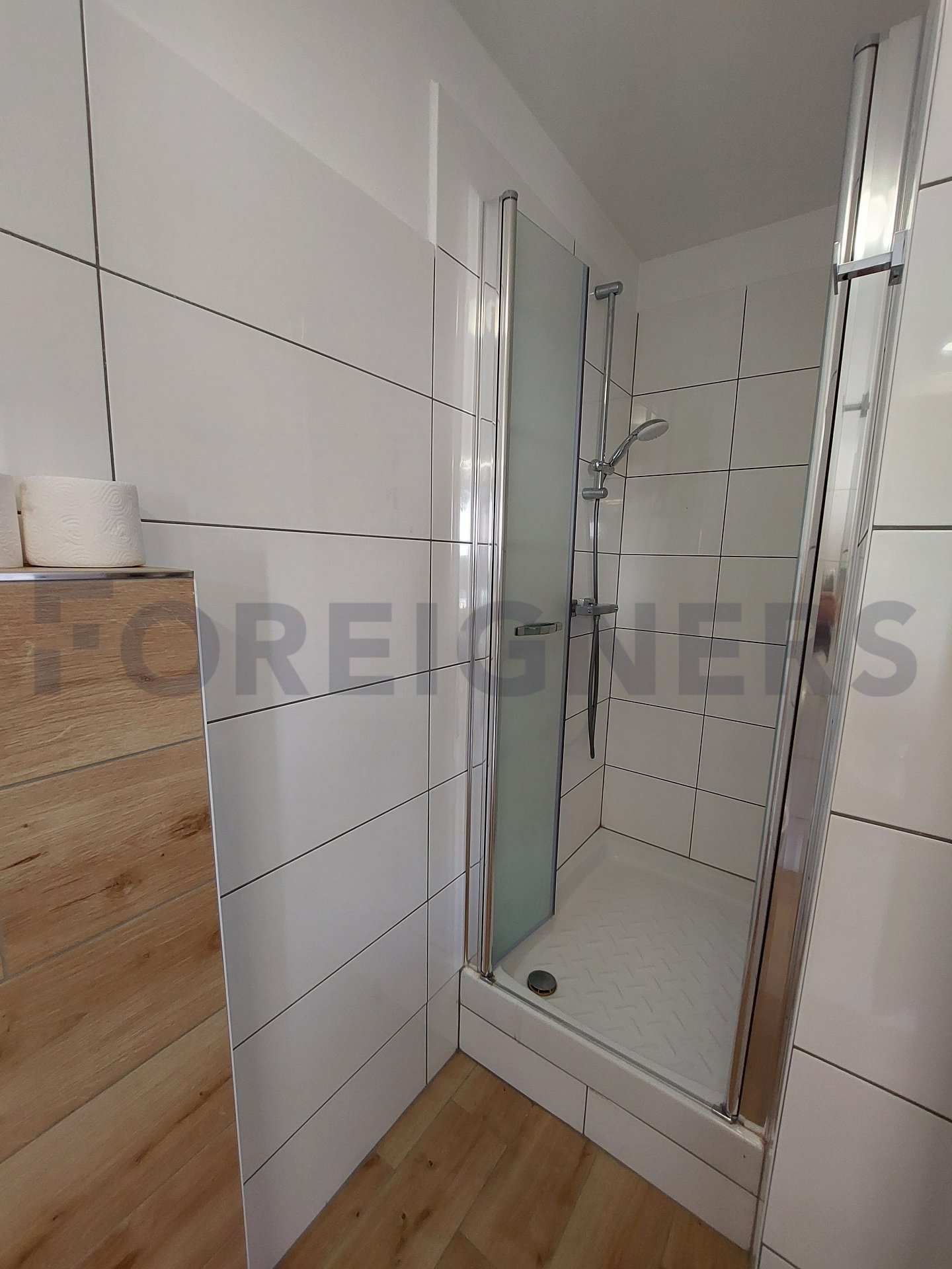 Bathroom: shower, wash-basin with a mirror, and toilet.