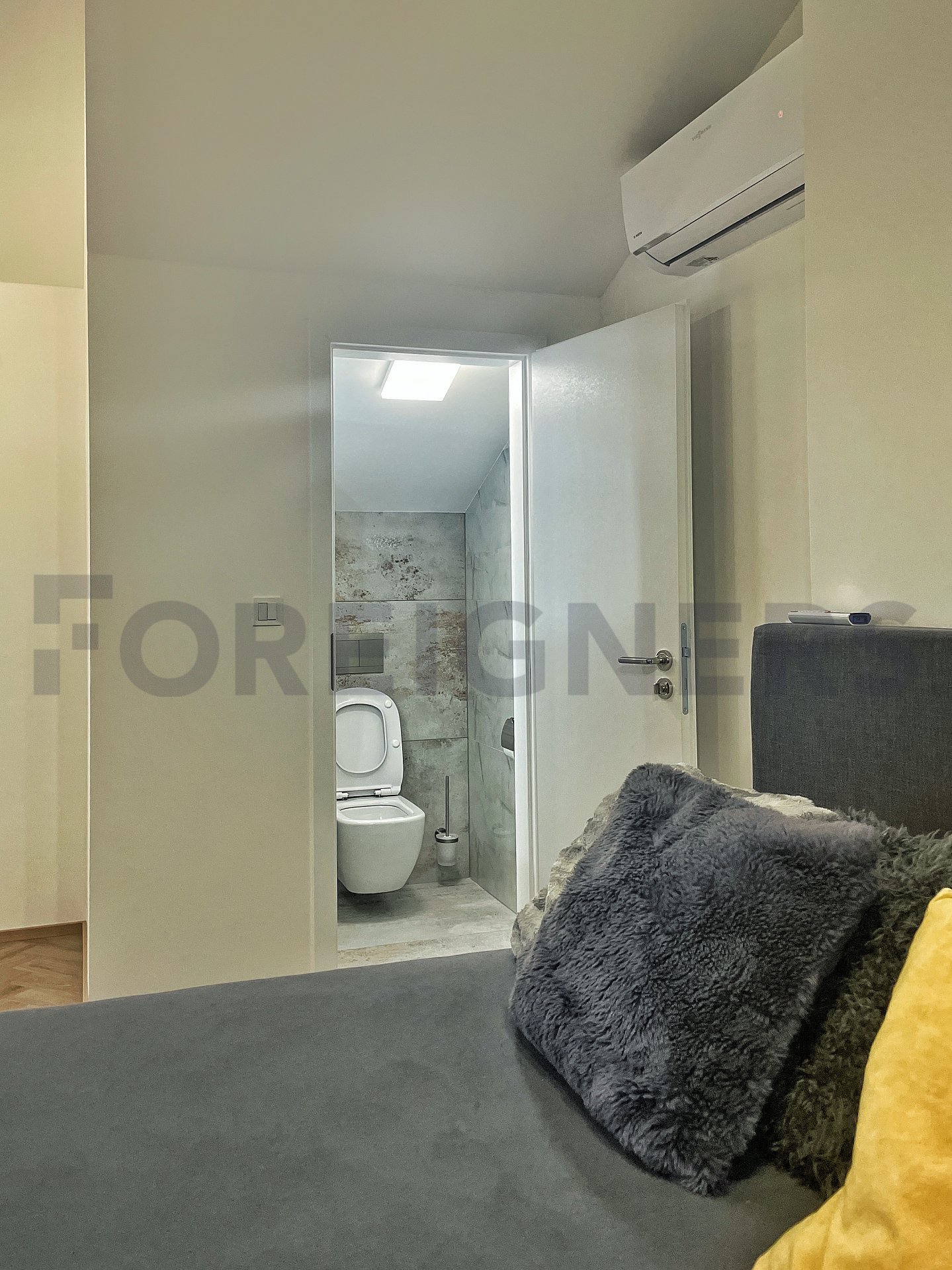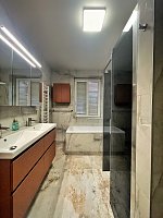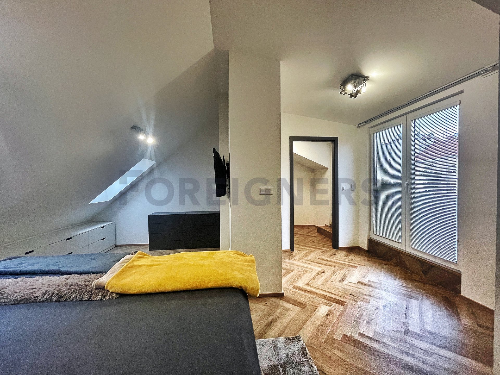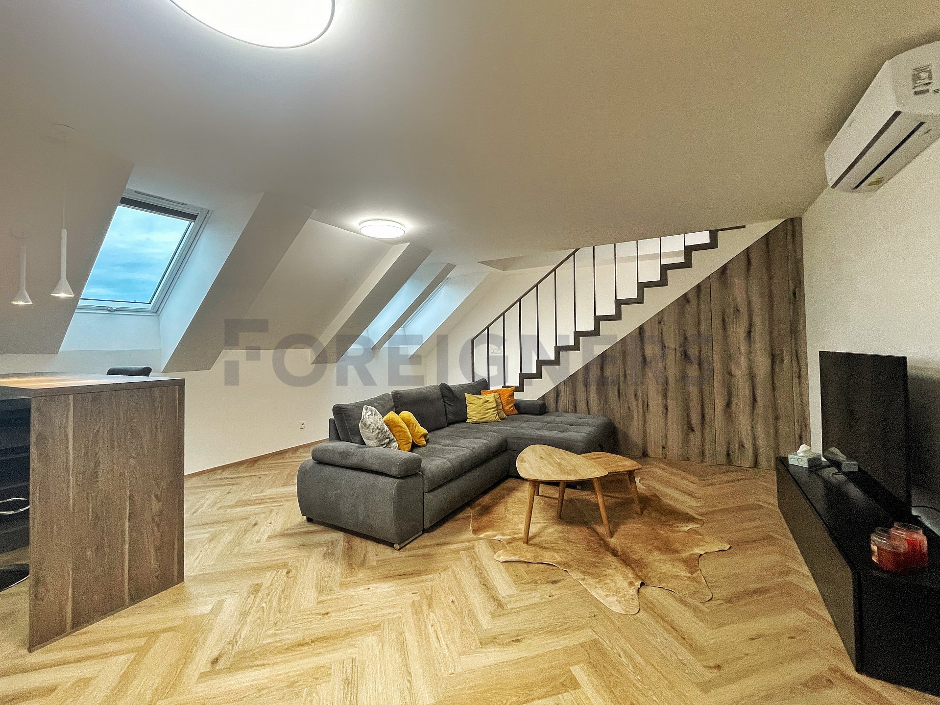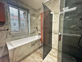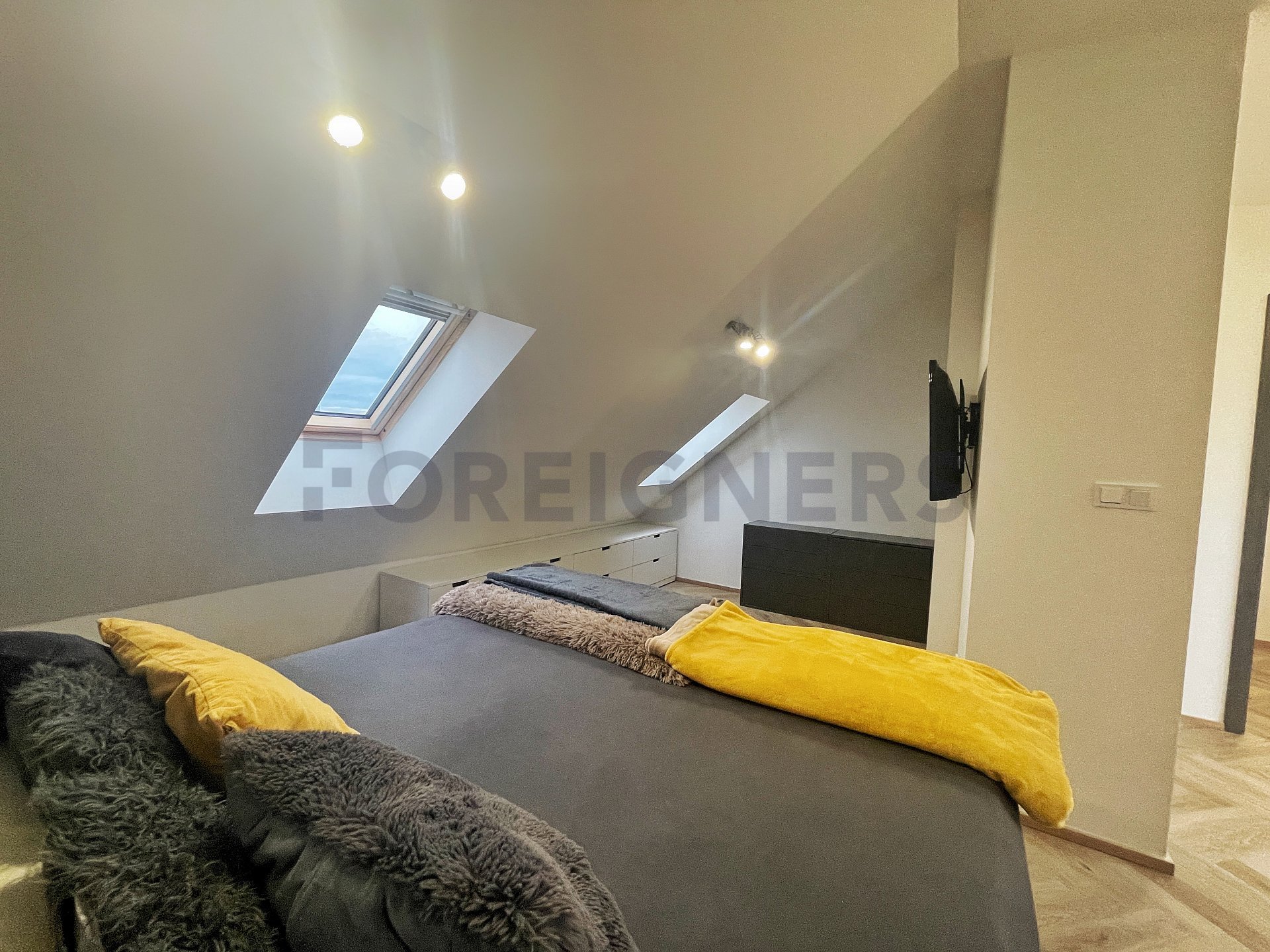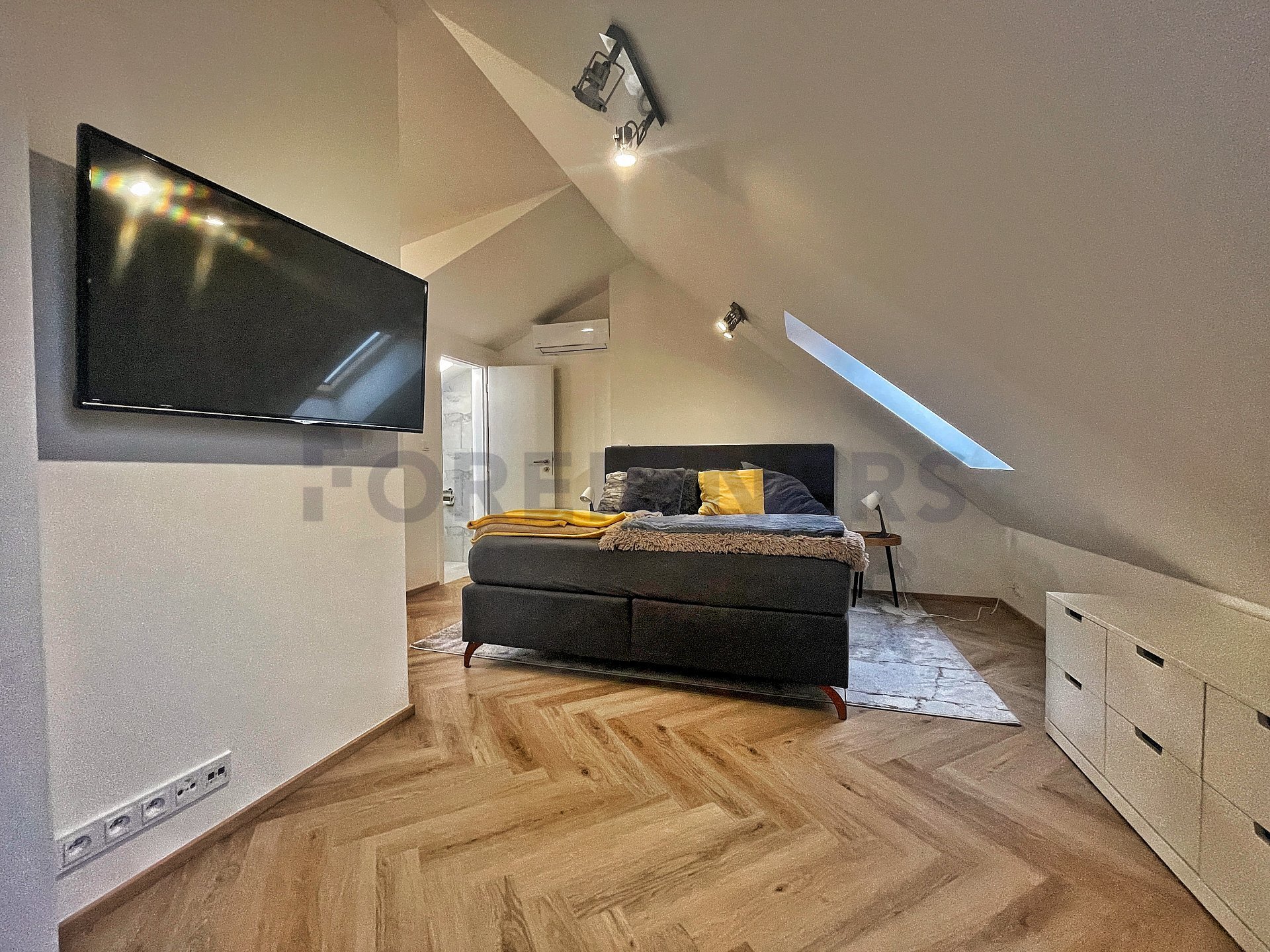 In the apartment, the latest technologies have been used to ensure maximum comfort for tenants - underfloor heating in all rooms, air conditioning in each bedroom and the living room, large-format tiles for the bathroom walls and floors, as well as toilet and bidet showers. Throughout the apartment, there are seamless doors with magnetic locks, electric curtains in the bedroom, horizontal blinds, and shading for the skylights.
