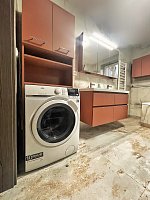 The heart of the apartment is a spacious living room with a large, comfortable sofa bed and a 58” QLED Samsung Smart TV, connected to a fully equipped kitchenette with Whirlpool appliances, an ice maker, and kitchen utensils. The main bedroom on the first floor is furnished with a Boxspring bed (180x200cm), cabinets, and a 43” Smart Gogen TV, and it has direct access to a beautiful terrace. There is also a separate toilet near the bedroom. The second bedroom is located on the ground floor, where there is also a very spacious bathroom with a bathtub, shower, and another toilet. The apartment includes an AEG washer-dryer combo. Under the stairs in the living room, there is a custom-made storage space serving as a wardrobe.