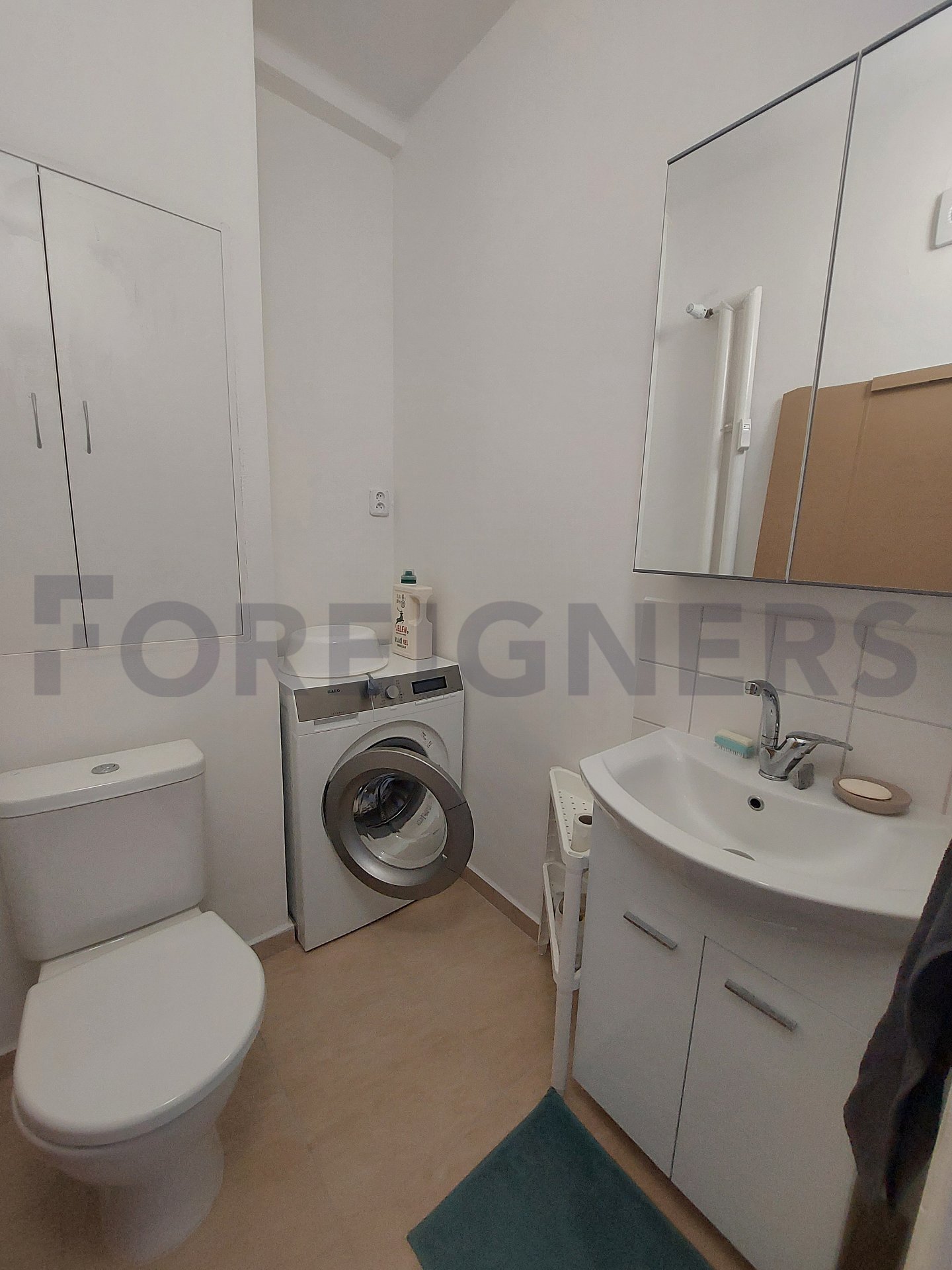 The Apartment consists of entrance hall with built in wardrobe. Bathroom with a bathtub, sink and a mirror. Separate toilet with washing machine, sink and mirror. Kitchen with a kitchen unit with a gas stove, an electric oven, a fridge with a freezer, a digester, a kettle, a toaster, sink, and dining table with 4 chairs.