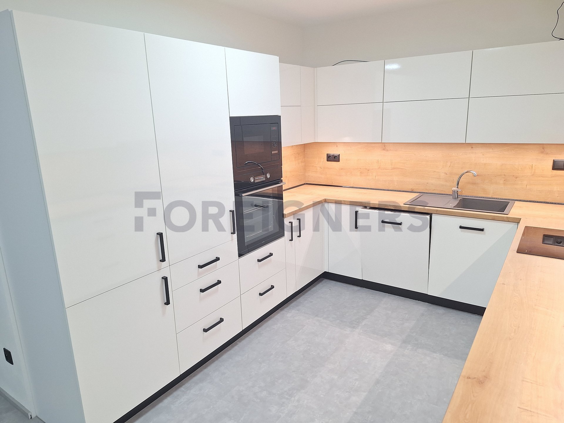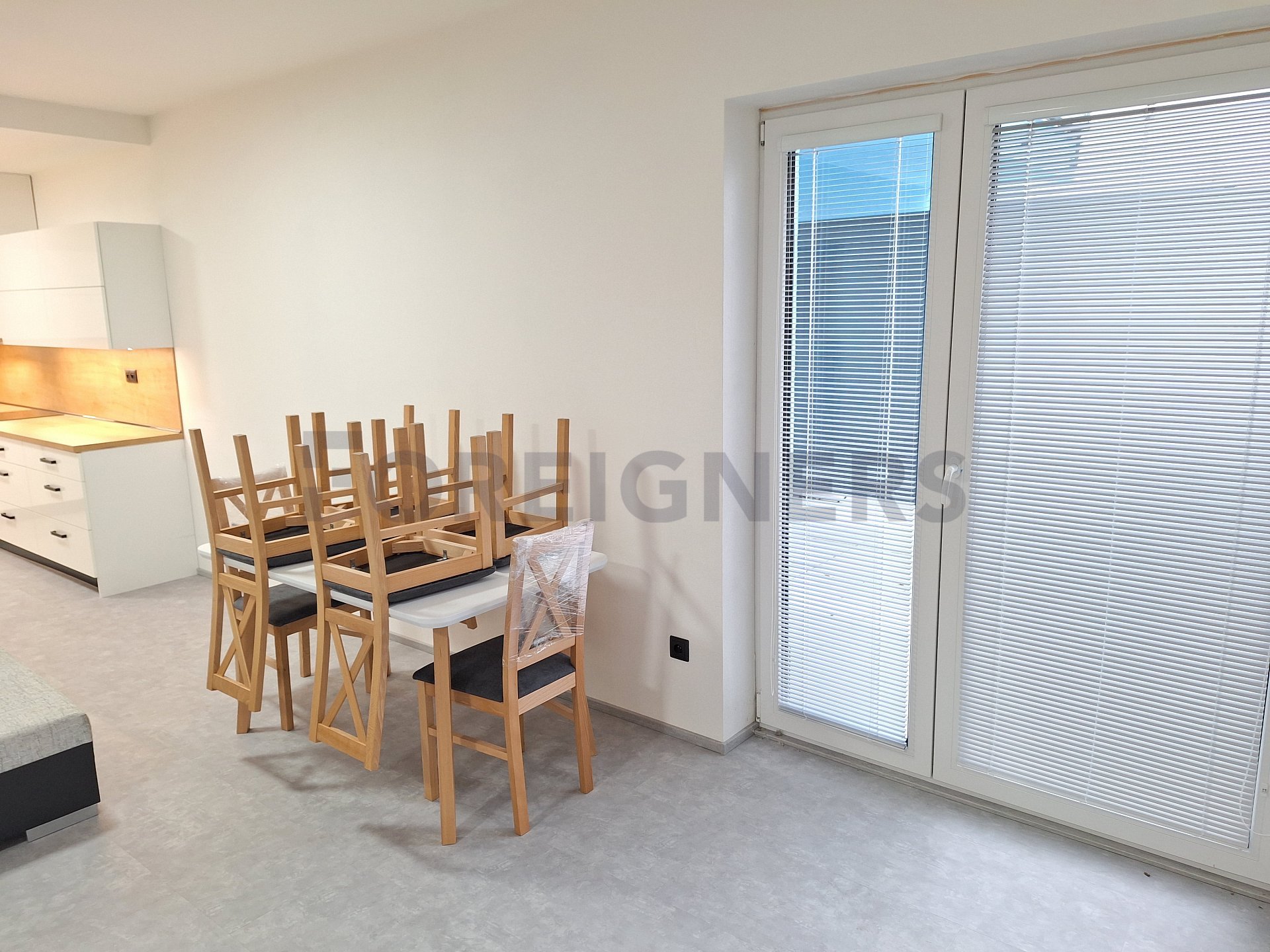 The apartment is rented partly furnished with an equipped kitchen, i.e. refrigerator with freezer, dishwasher, built-in electric oven, microwave, ceramic hub, hood.