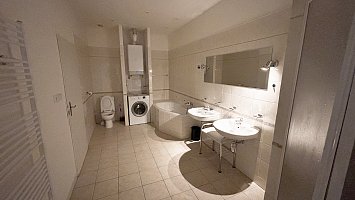 Bathroom – shower, bathtub, two sinks, toilet, washing machine