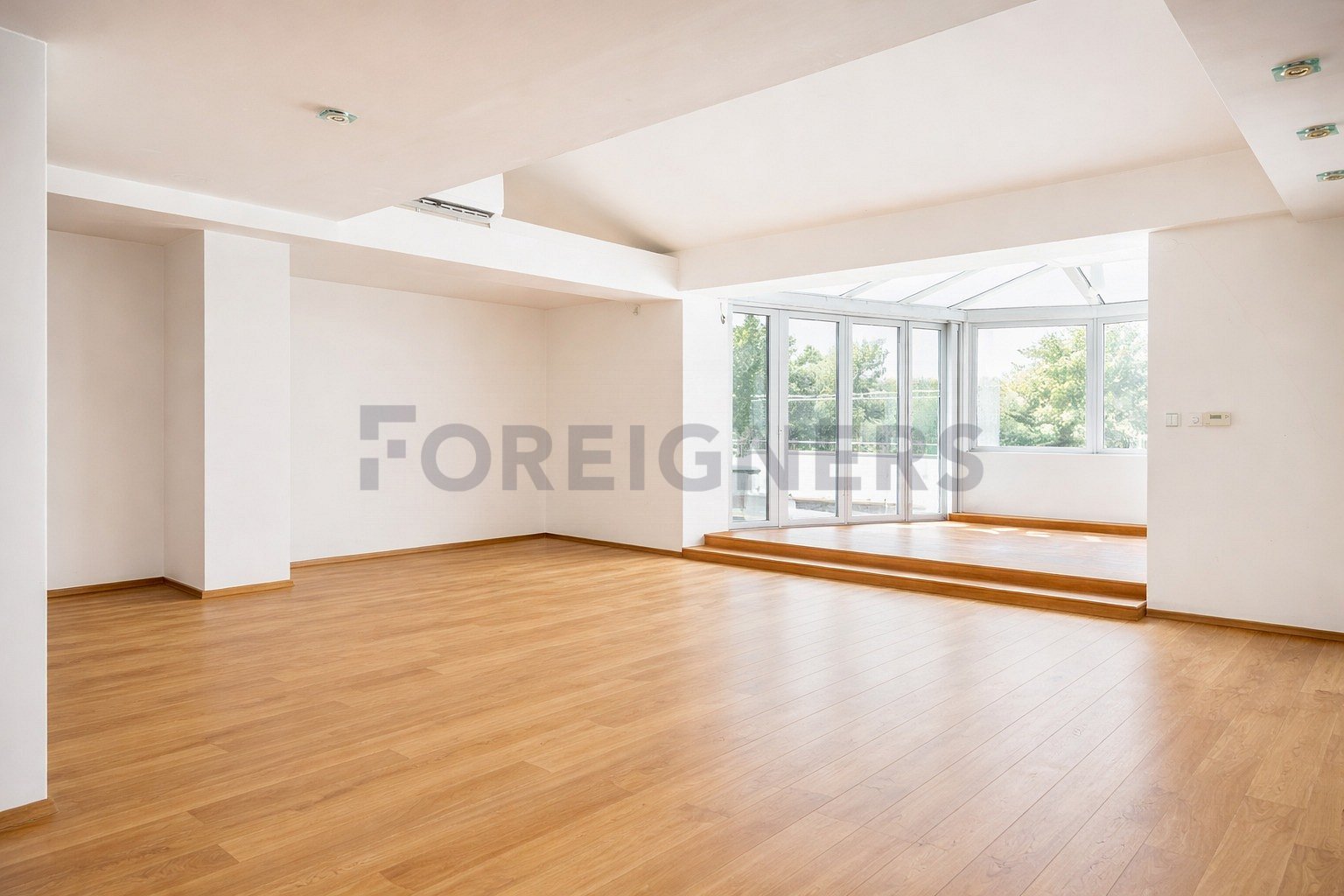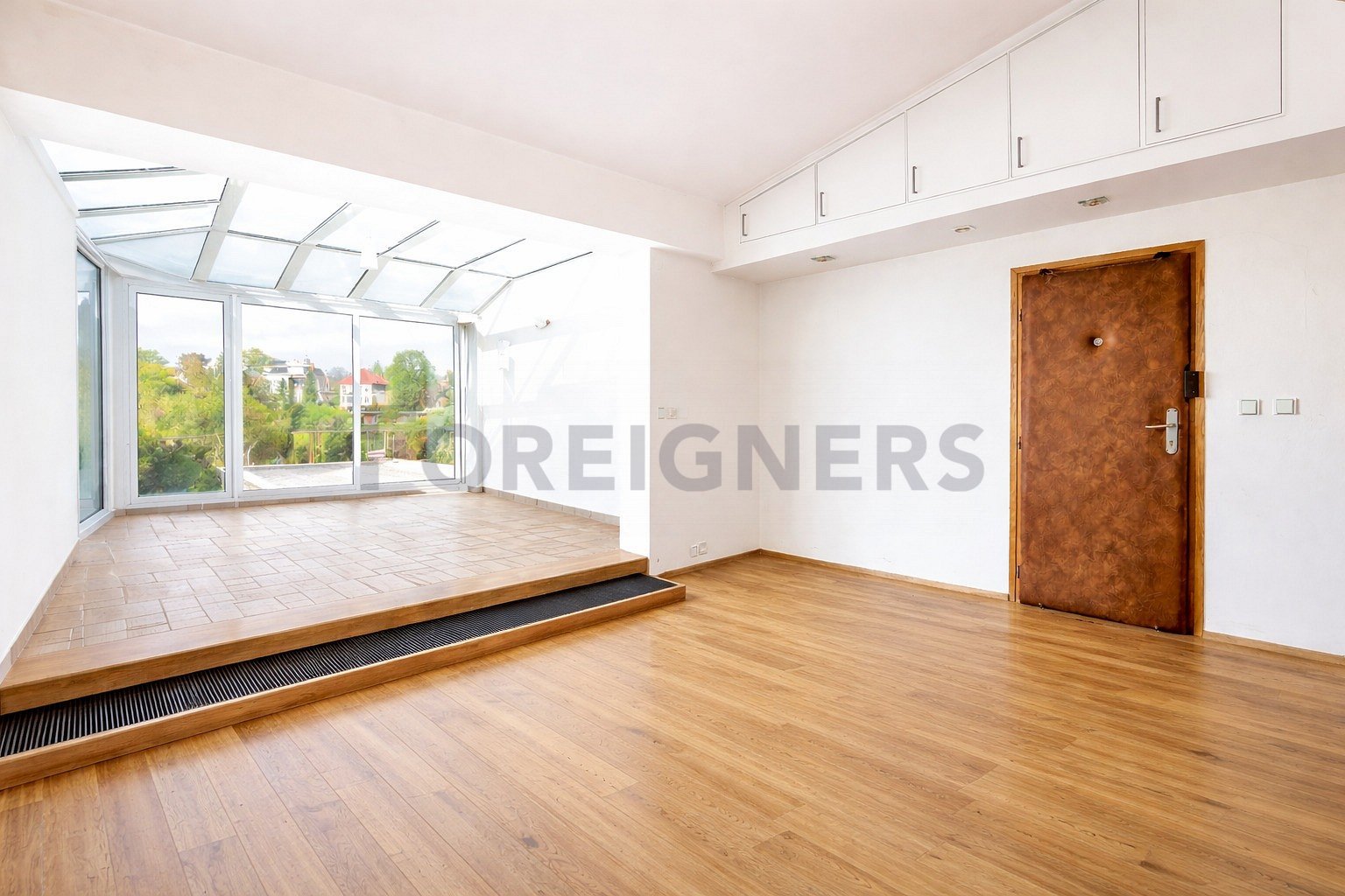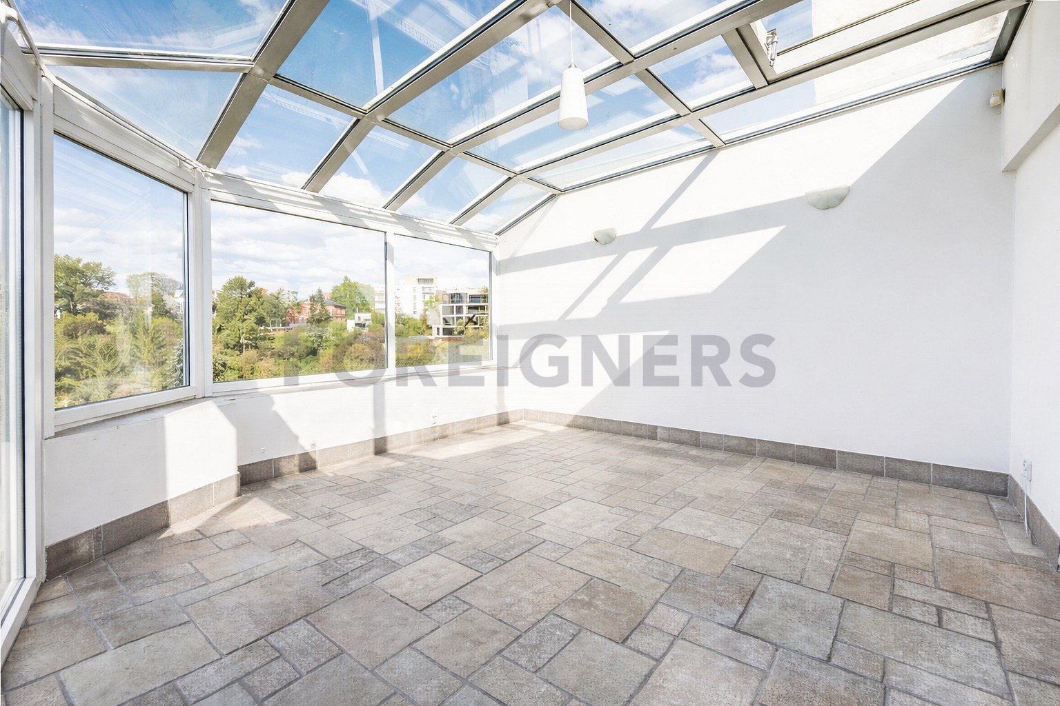 The dominant feature of the apartment is a glazed winter terrace of 19 m², ideal for relaxation with views of the surrounding greenery. Thanks to its position on the top floor and the fact that there are only two apartments per floor, the apartment offers an exceptional level of peace and privacy. The interior is an impressive space with a strong emphasis on light and privacy.
