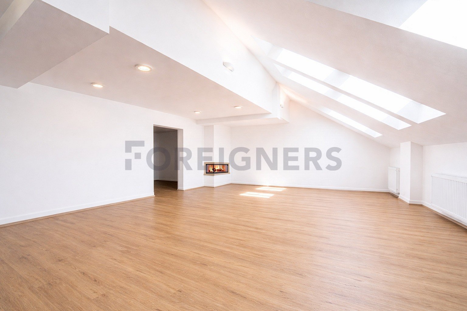 The apartment consists of several spacious and bright rooms with built-in storage. It includes a bedroom of 13.89 m², a room of 8.7 m², a separate kitchen with an area of 45.73 m², and a living area of 51.56 m², combining elegance with practicality. The living area is complemented by a fireplace, creating a warm and inviting atmosphere.