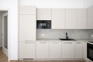 Custom-made kitchen unit, which effectively uses both work space and storage space. The kitchen is equipped with a built-in refrigerator, oven, induction hob, dishwasher and microwave.