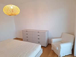The apartment is equipped with a modern kitchen featuring an induction cooktop, sink, dishwasher, built-in oven, microwave, and a fridge with a freezer. The living room is equipped by a sofa, a conference table and a TV, there is an access to balcony from the living room. In the bedroom you can find a double bed with mattresses, an armchair and a dresser. The bathroom includes a shower, sink with a cabinet, and a heated towel rail. The entrance hall has a fitted wardrobe unit. The floors are covered with wooden parquet, and the windows are plastic with double-glass insulation.