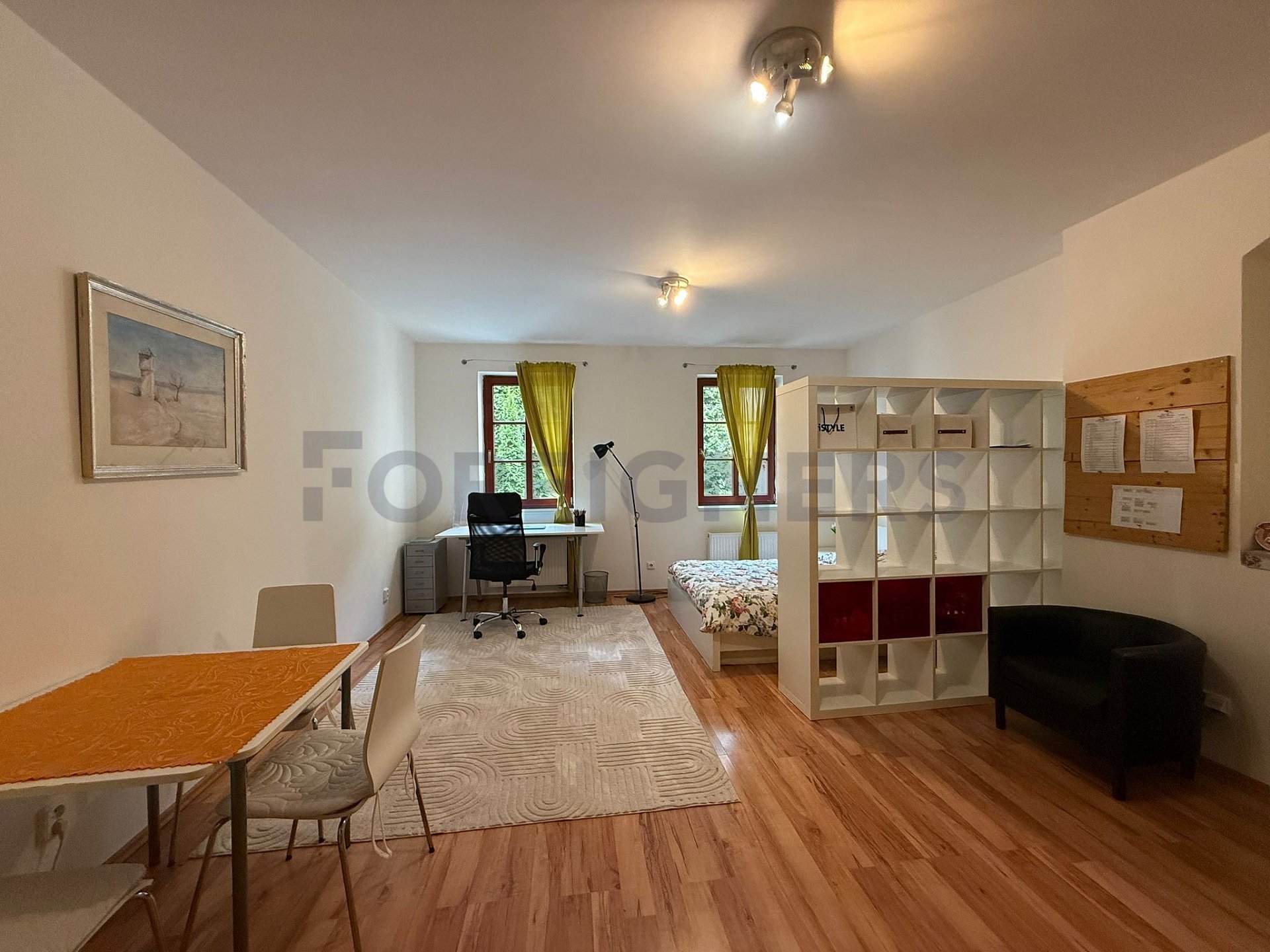 This cozy and spacious studio is situated on the first floor, with windows overlooking a quiet inner courtyard—offering peace and privacy away from street noise. The layout includes an entrance hall, a bathroom, and one bright, open room with a kitchen corner.
