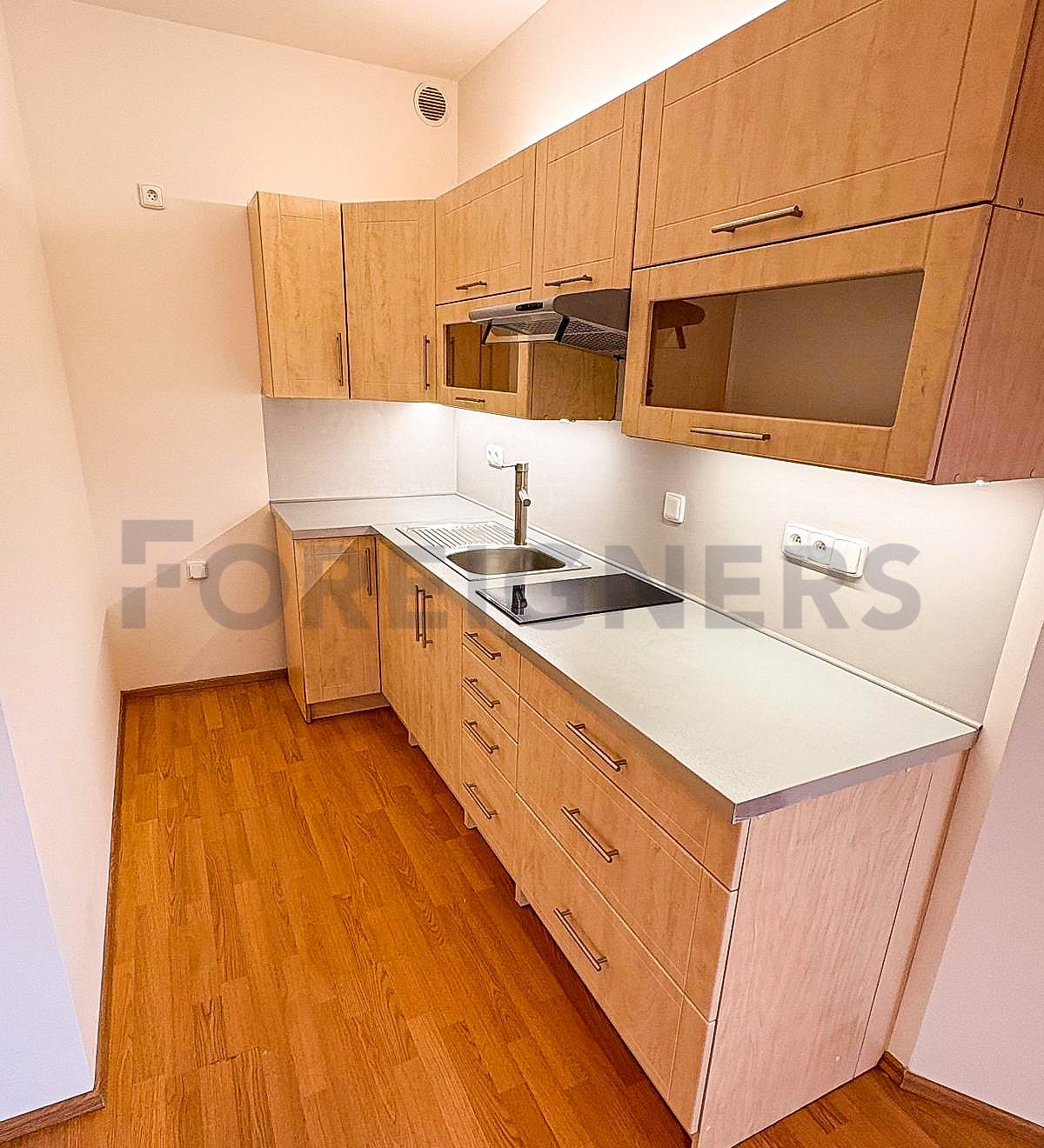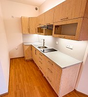 The apartment is rented unfurnished, except for the kitchen, which is equipped with a kitchen unit and a stove. There is also a built-in wardrobe in the hallway and a cabinet in the bathroom. A washing machine can be provided by the landlord.