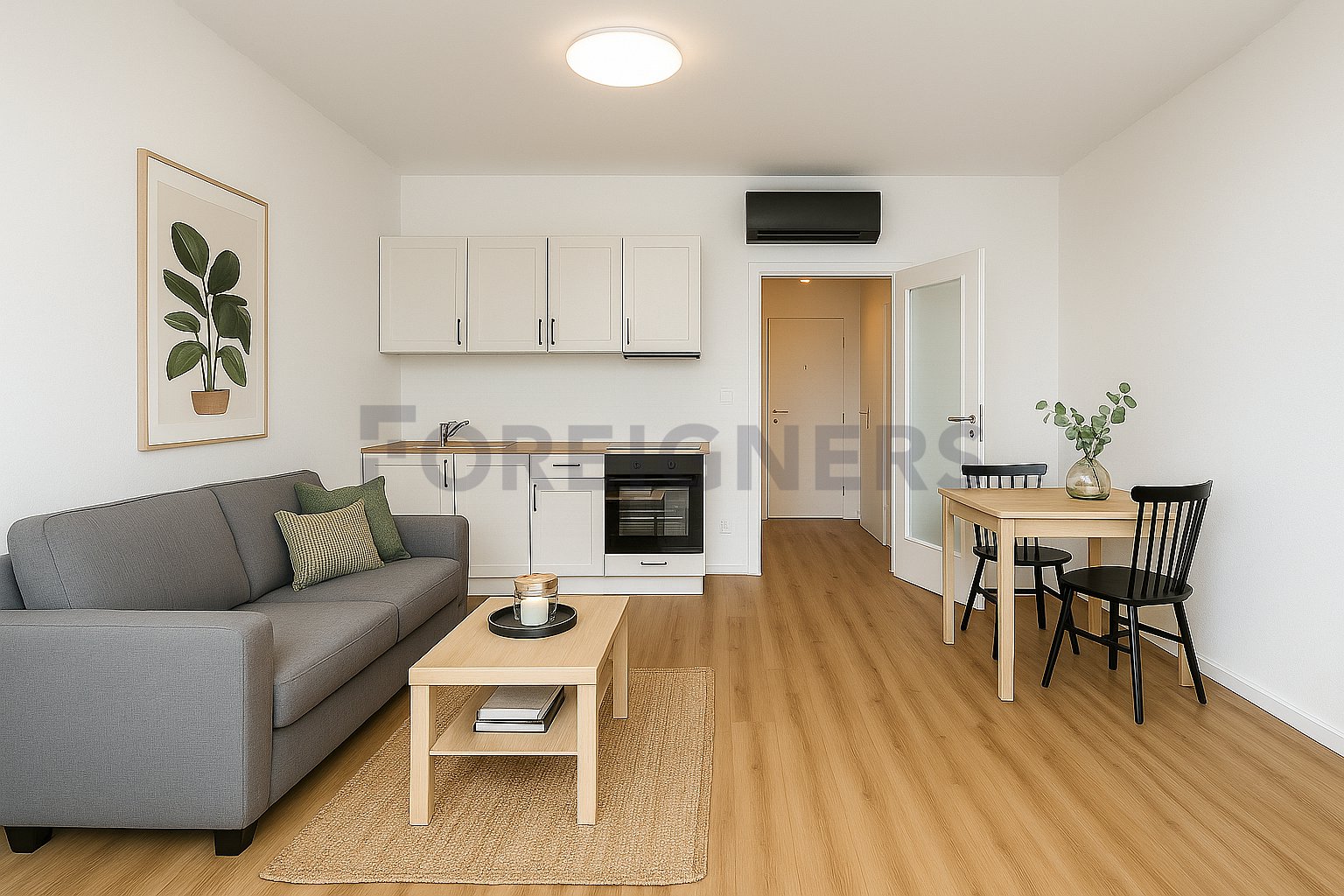 The apartment will be partly furnished. The living area will include a kitchenette with built-in appliances, a dining table with chairs, a sofa, and a practical wardrobe in the entrance hall.