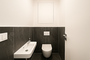The bathroom with a shower and separate toilet is designed in a modern and minimalist style.