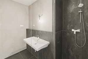 The bathroom with a shower and a separate toilet are designed in an elegant dark style, creating a modern and clean look.