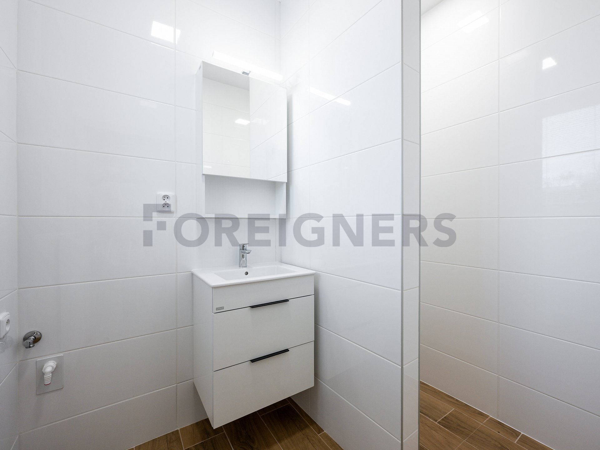 The apartment is partly furnished and features practical, modern amenities. The kitchen is equipped with new built-in appliances, including an electric oven with an induction cooktop and a dishwasher. The bathroom includes a shower and a connection for a washing machine, the toilet is separate.