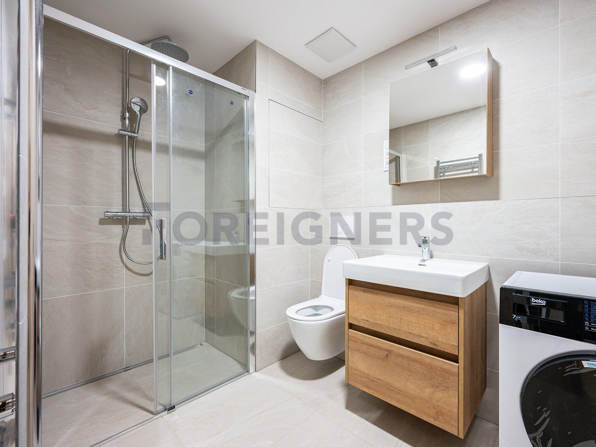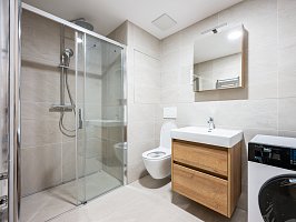 The bathroom combines a shower corner with a toilet and includes a washer-dryer and a heated towel rail. The room is equipped with air conditioning and underfloor heating, providing comfort all year round. The floors are a combination of vinyl and ceramic tiles, and the windows are plastic with electric blinds.