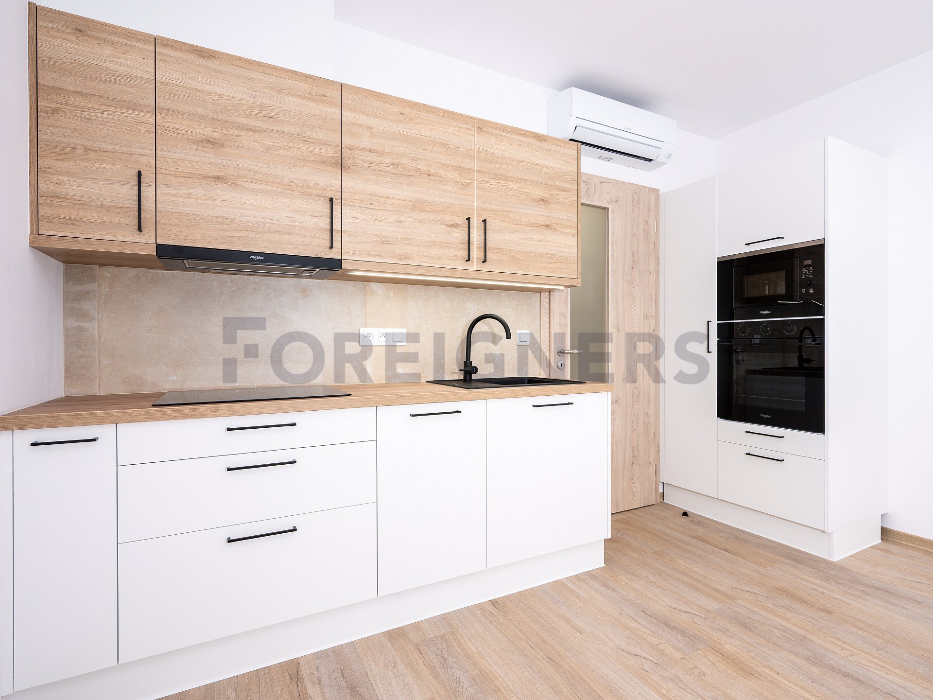 The apartment is partly furnished and offers modern amenities for comfortable living. The kitchen is equipped with built-in appliances – an oven, dishwasher, and microwave, while the refrigerator is freestanding.