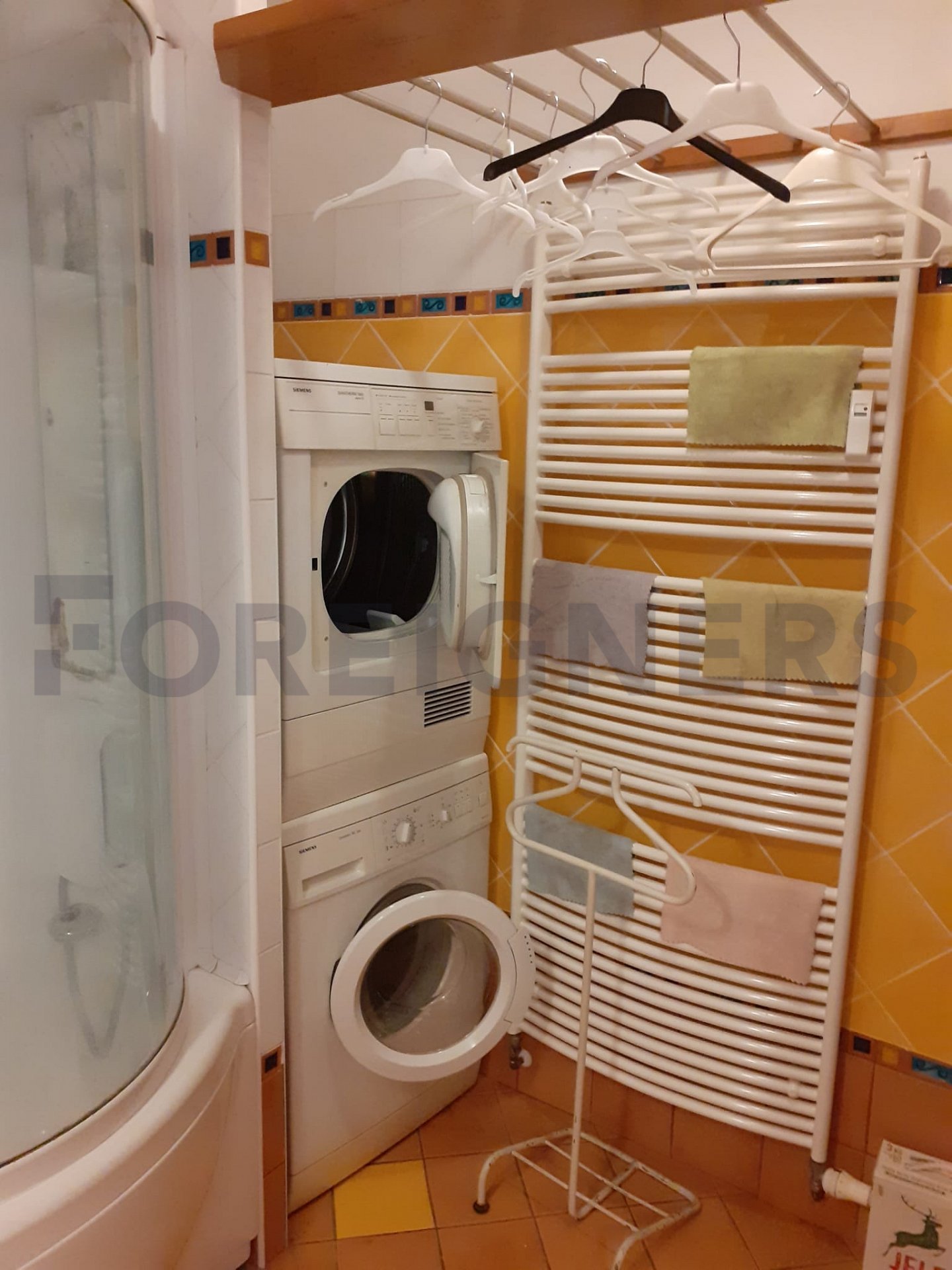 It is equipped with a washing machine, dryer, American-style fridge with freezer, a bathtub, and a bed with a view of the sky or the nearby park.