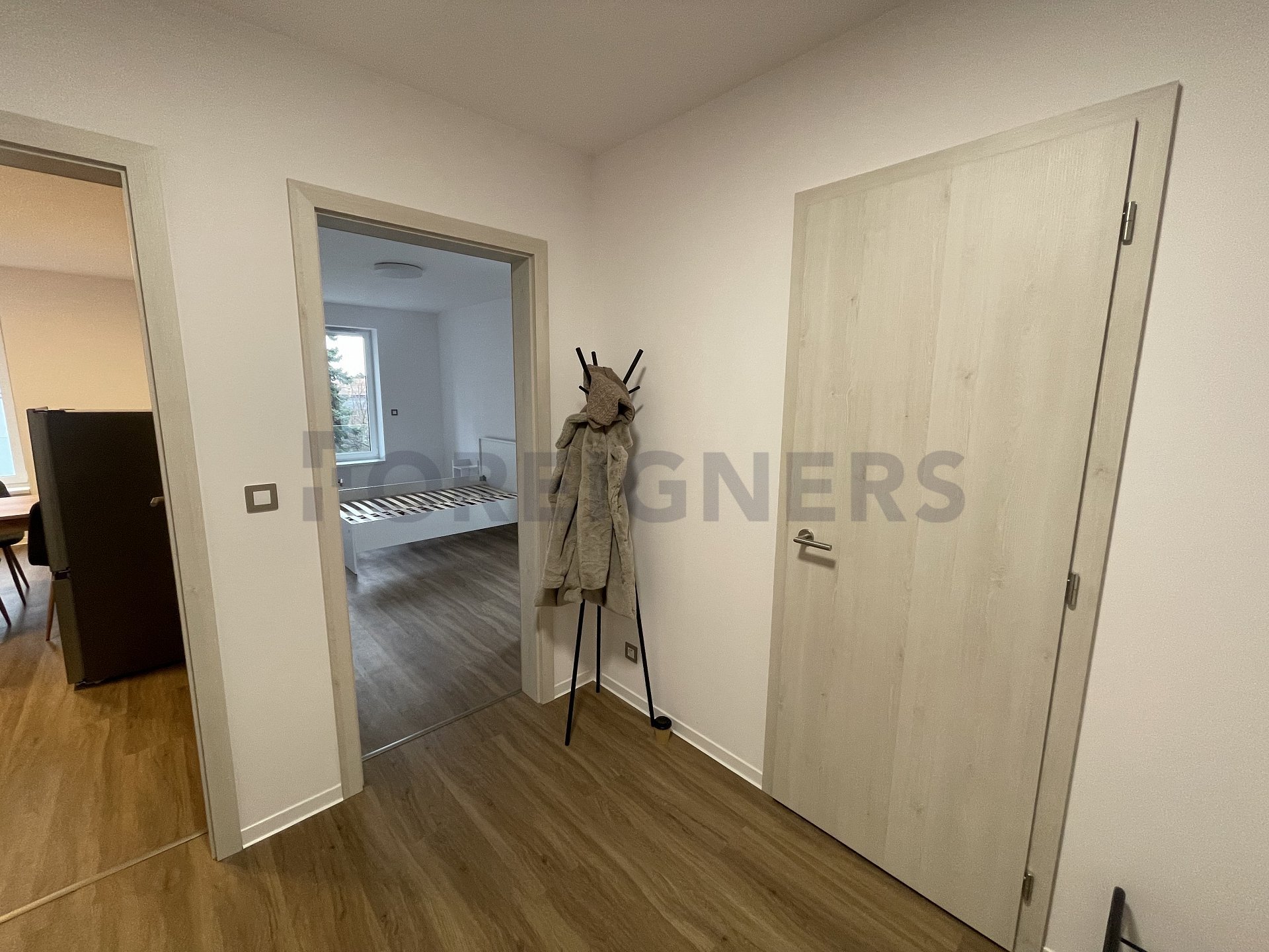 All equipments are modern and brand new. Kitchen corrner is equipped with fridge and freezer, dishwasher, induction stove with electric oven and dining table with 4 chairs. Living room area consists of sofa, coffee table and tv stand. One bedroom is furnished with the wardrobe and double bed with night stands. The second bedroom can be used as office and stay empty or as second bedroom with double bed. In the bathroom we can find a spacious shower corrner, heating racks, sink with cabinet and mirror and as well the wasching machine with a dryer. In the corridor there is coat hanger and shoe racks.