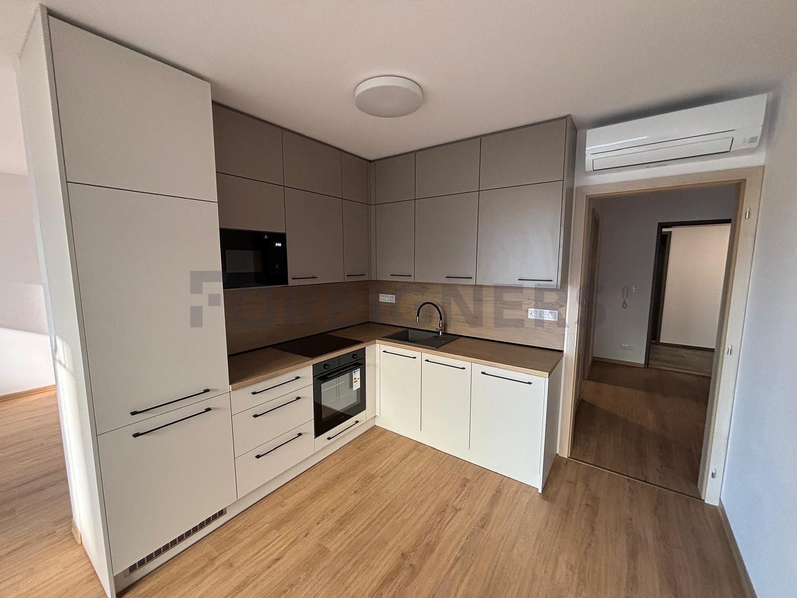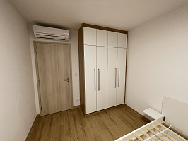 This is fully furnished apartment in modern style. Kitchen corrner is equipped with in-built fridge with freezer, indcution stove with electic oven, microwave oven and dishwasher. In the dining area is dining table wtih 4 chairs. Living room area is furnished with the sofa ( extandlbe with storage space), coffee table and tv stand. On the balcony we can find table with chairs for relaxing moments. Bathroom has shower corrner, toilet, sink with cabinet and mirror, heating racks and washing machine/dryer combo. In the practical storage room you can find lots of shelving and bedroom is equipped with the double bed with side stands and wardrobe. There is AC placed in the bedroom and living room/kitchen area.