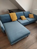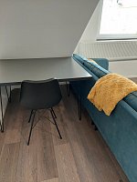 Kitchen with kitchen corner, induction with oven, fridge, freezer, microwave, hood, bar, dining table with 4 chairs. Living room with sofa with coffee table, PC table and TV table.