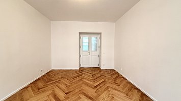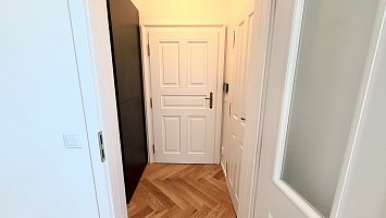The interior features high-quality wooden floors and a newly designed Hanák kitchen that harmoniously complements the overall style of the apartment. The apartment will be fully furnished, offering immediate and comfortable move-in without the need for any additional investment. The bedroom also enjoys a direct view of the Žižkov Television Tower.