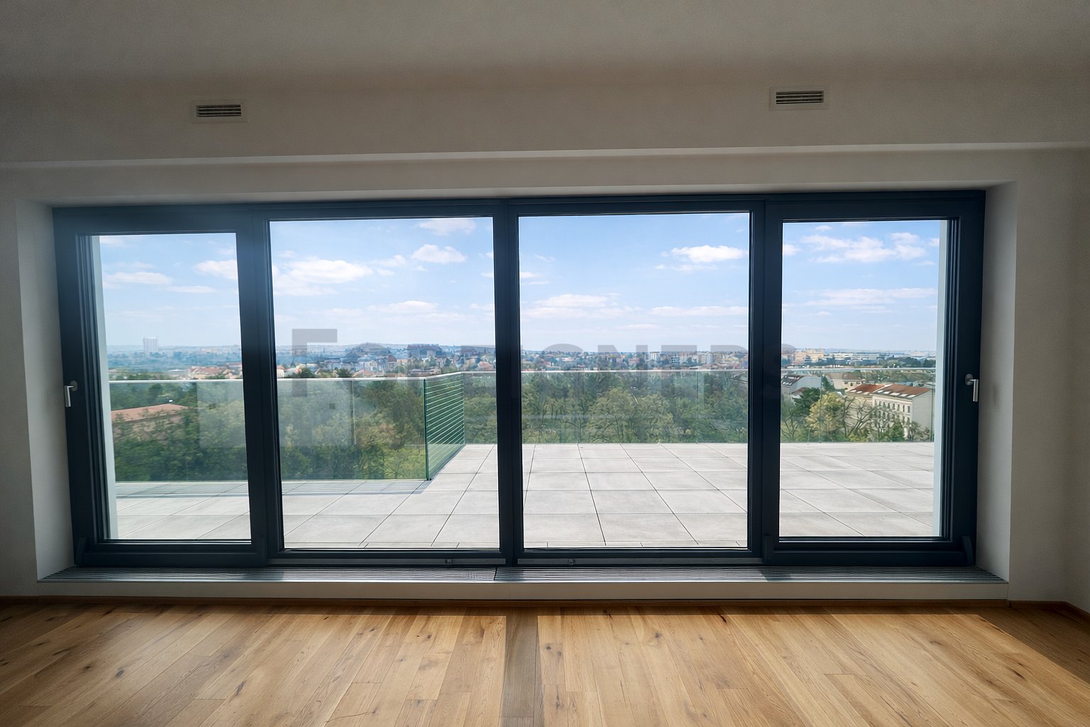 The apartment is located on the 10th (top) floor, ensuring maximum privacy, peace, and truly unique views of the park and the Brno skyline. Each room has direct access to the terrace.