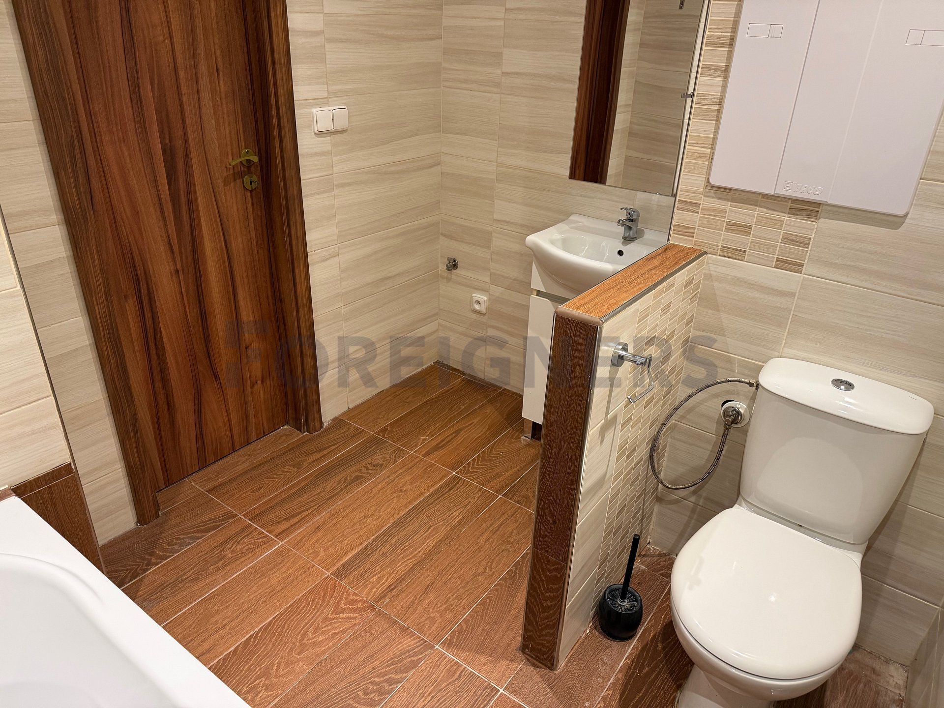 The bathroom is equipped with a classic bathtub, sink and toilet, which offers the perfect space for relaxation after a busy day.