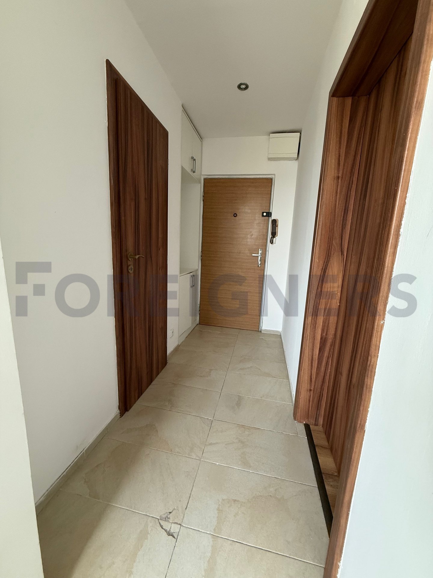 The apartment features a practical layout consisting of an entrance hallway, a main living/sleeping room, and a separate kitchen. The kitchen area is designed to comfortably fit a dining table and a refrigerator. The hallway connects all the rooms, including the newly renovated bathroom and a separate toilet.