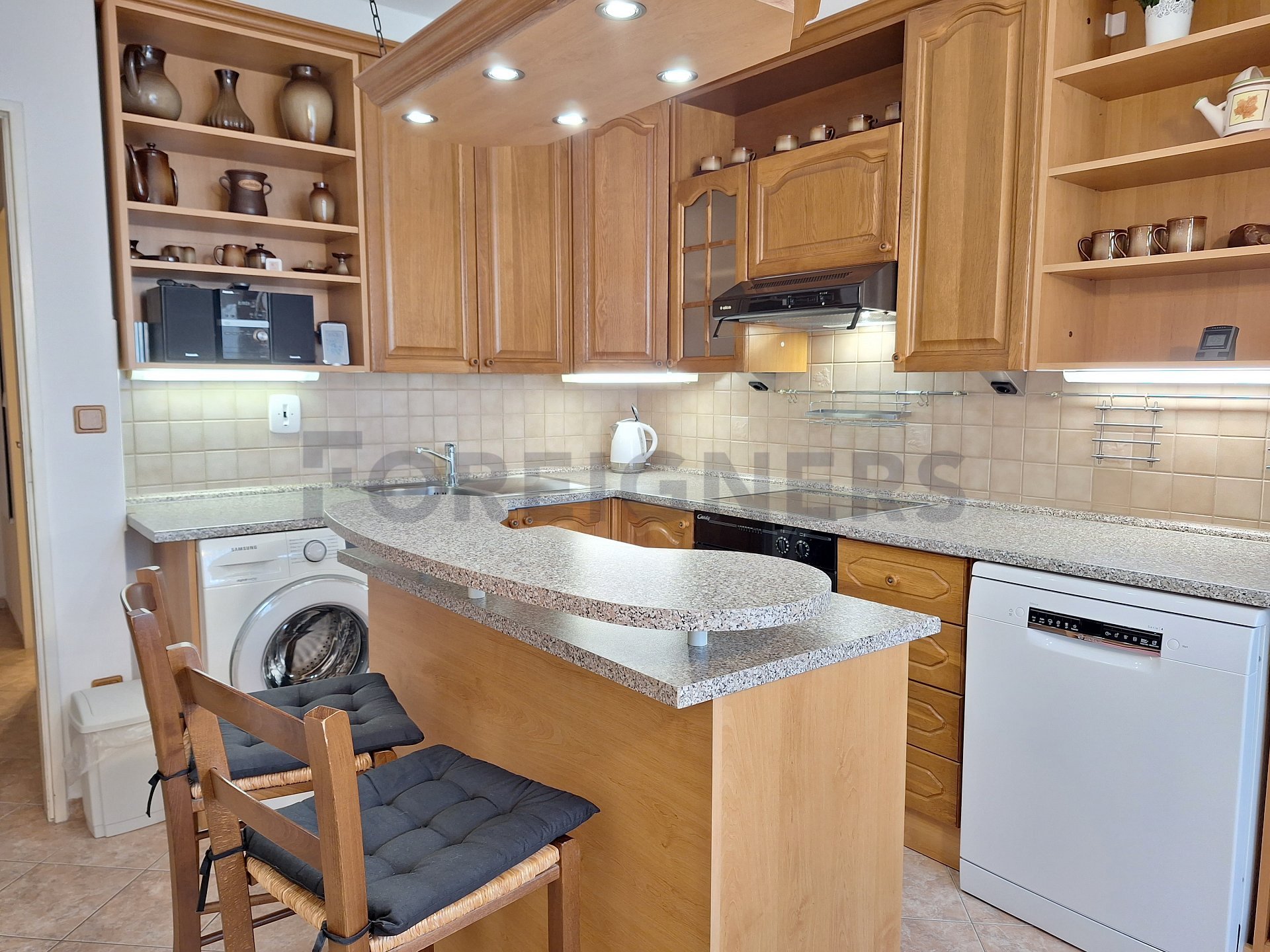 The apartment is offered furnished. The stylish kitchen has all appliances - refrigerator, electric oven, microwave oven, dishwasher, washing machine, hob and hood. In the kitchen you will also find a dining table with chairs and a television. There is an access to a balcony.