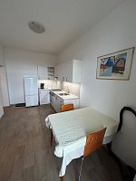 In the kitchen you will find a kitchen unit with an induction hob and oven, a fridge and a built-in dishwasher. Dining table with chairs.