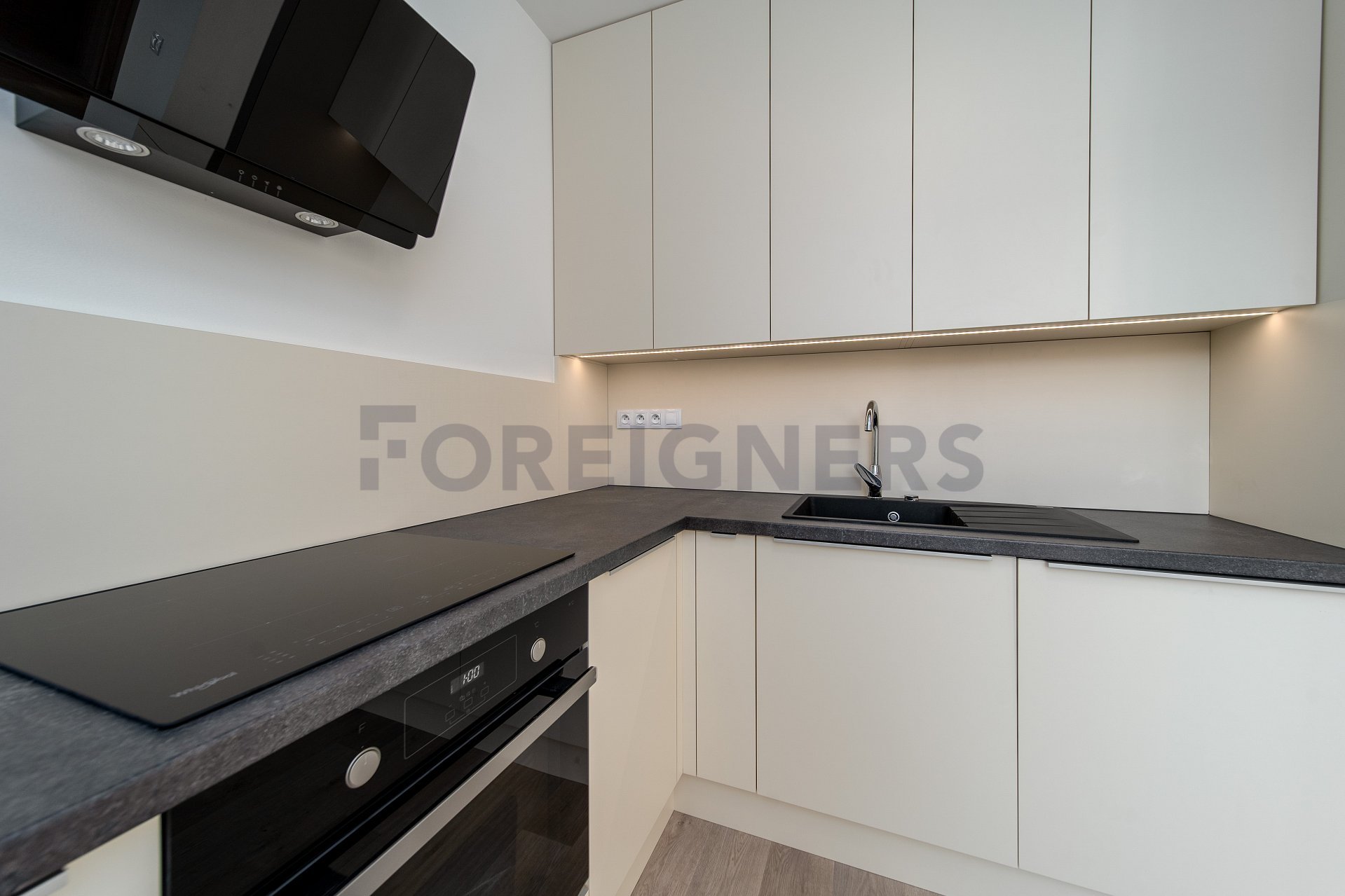 The apartment is rented with equipped kitchen unit with an induction hub, oven, dishwasher and a built-in refrigirator with a freezer.
