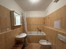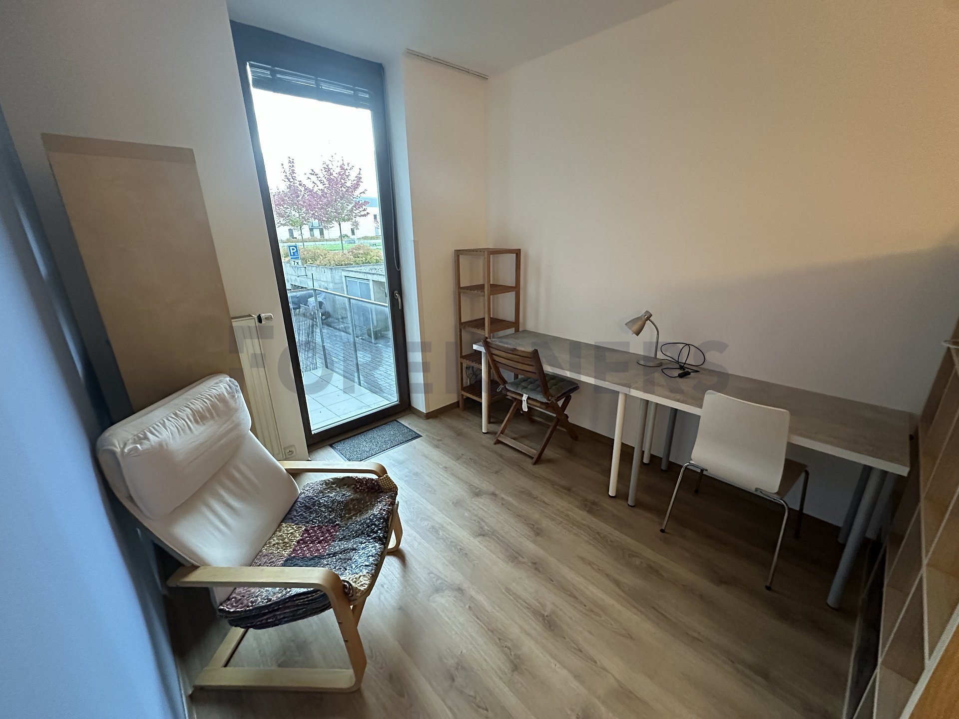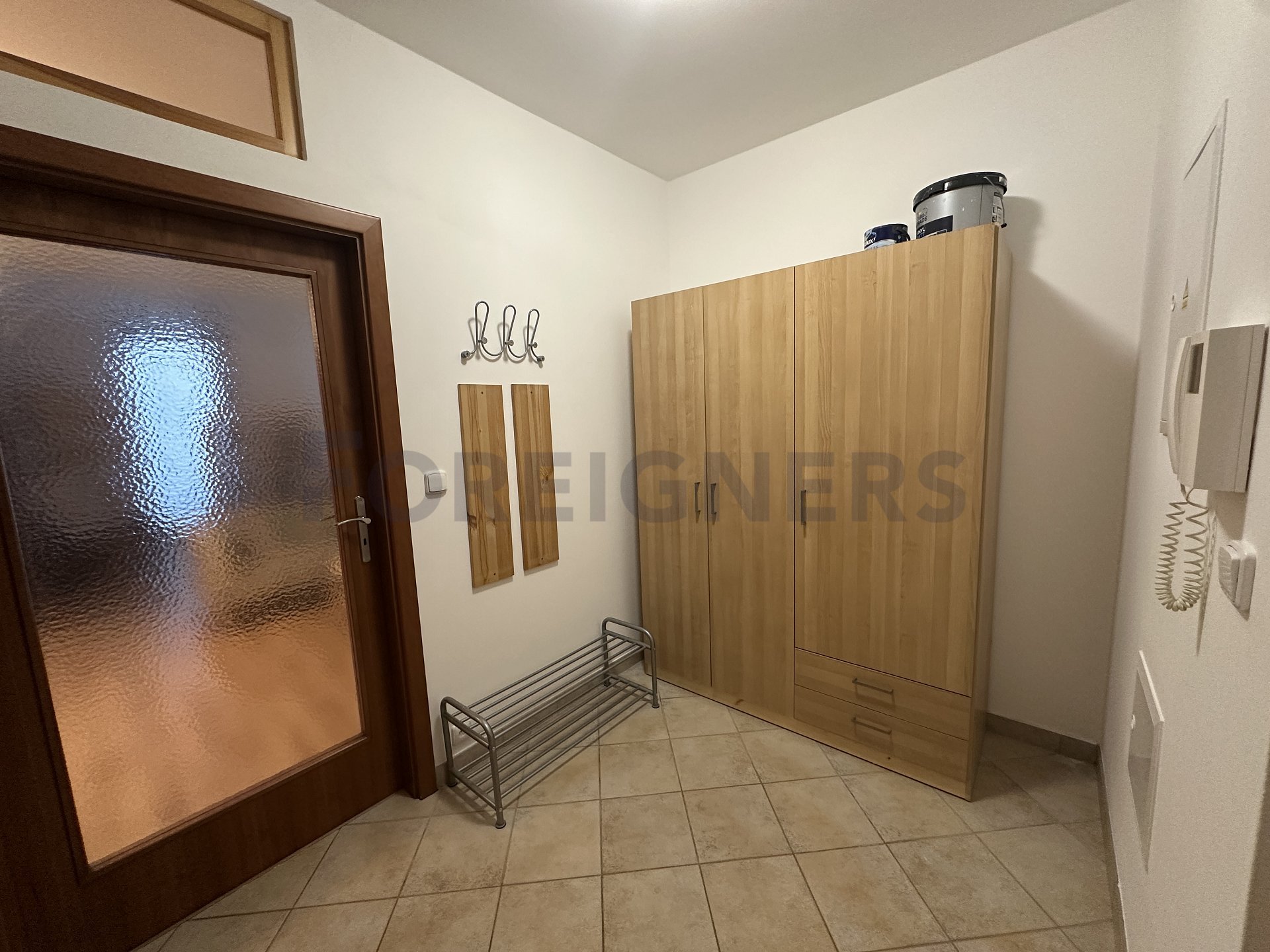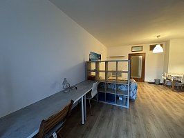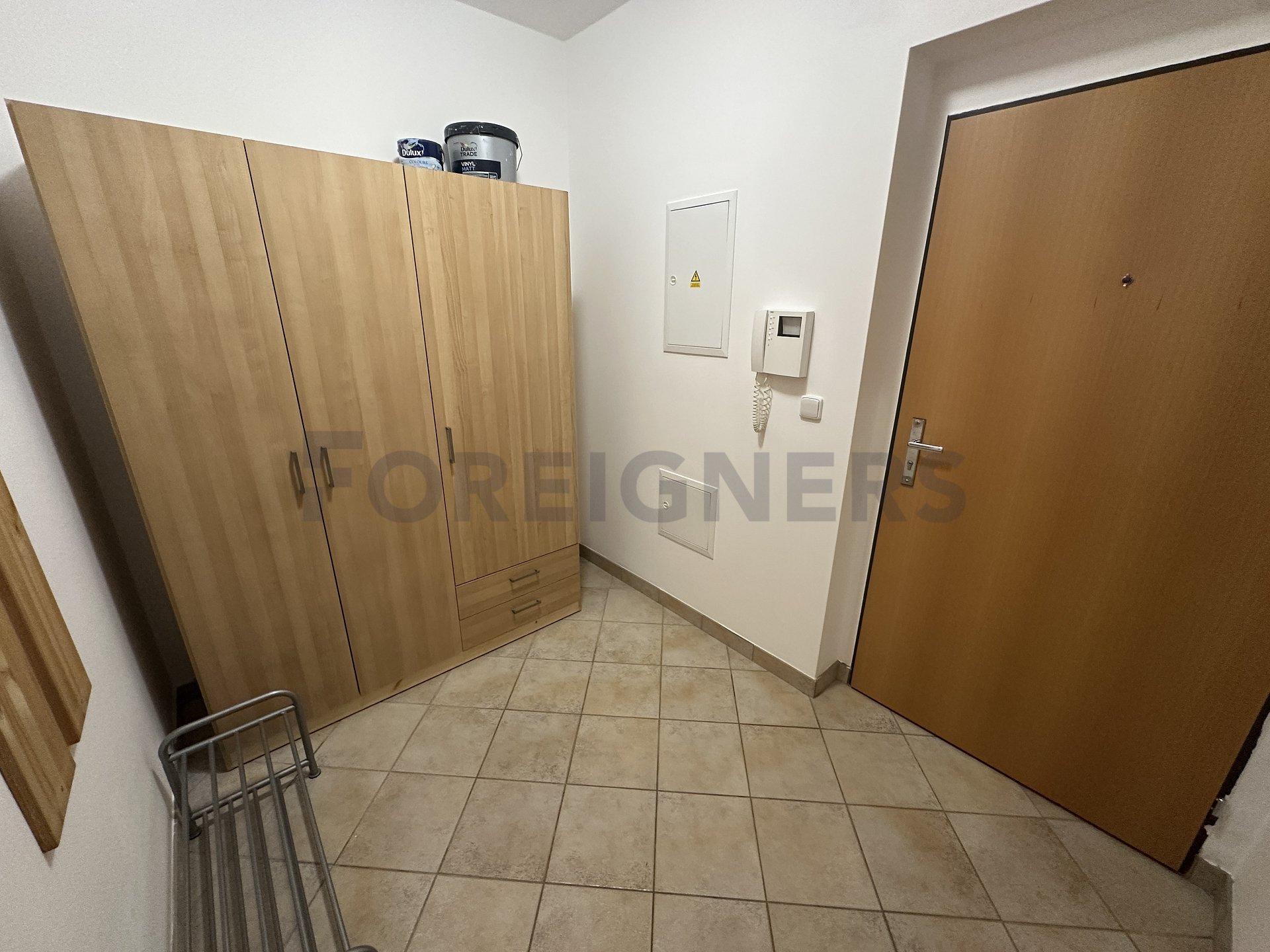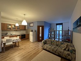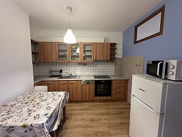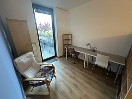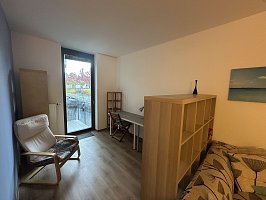 It consists of an entrance hall, bathroom with bathtub and toilet, one big room devided into kitchen with all the appliances including fridge with freezer, oven, dishwasher etc. and living room area with nice sofa, bookcase, pc table and so on. Then there is one small bedroom with a wardrobe. The apartment has got a balcony as well. Storage room can be used too.