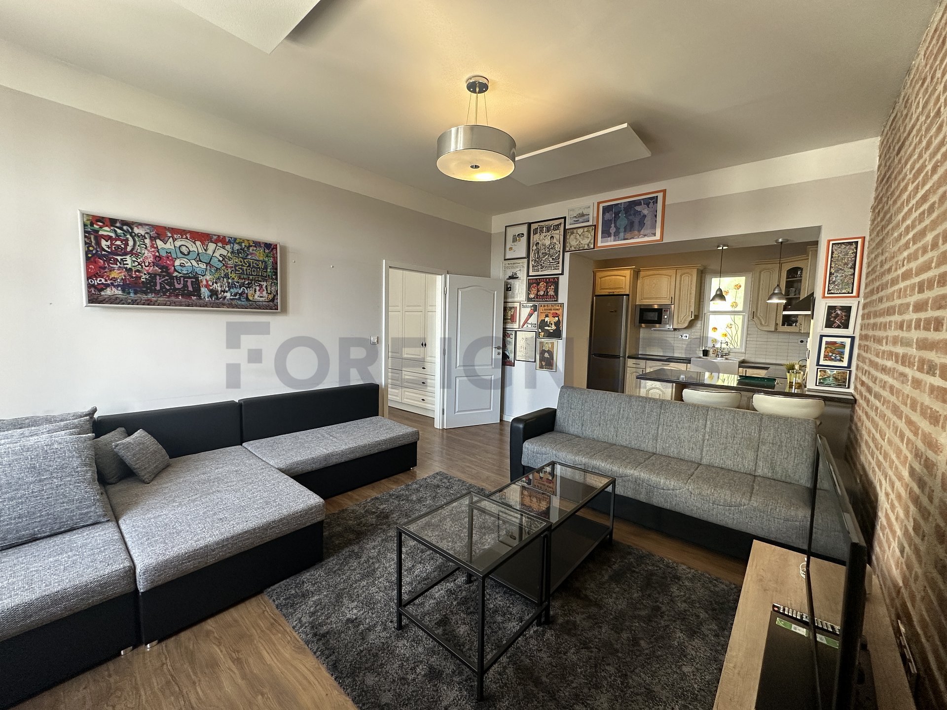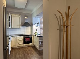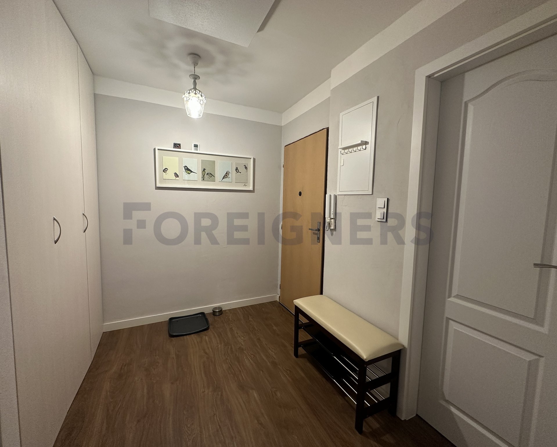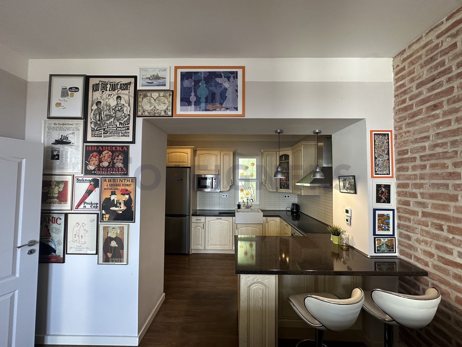 Fully furnished with modern furniture and appliances as you can see in the pictures. Kitchen - dishwasher, microwave, oven, huge fridge with freezer, bar with bar chairs etc.) Double bed, wardrobe, convertible sofa, study destk with chair, bookcase. You can also find there washing machine, clothes dryer, TV and bike as a bonus.